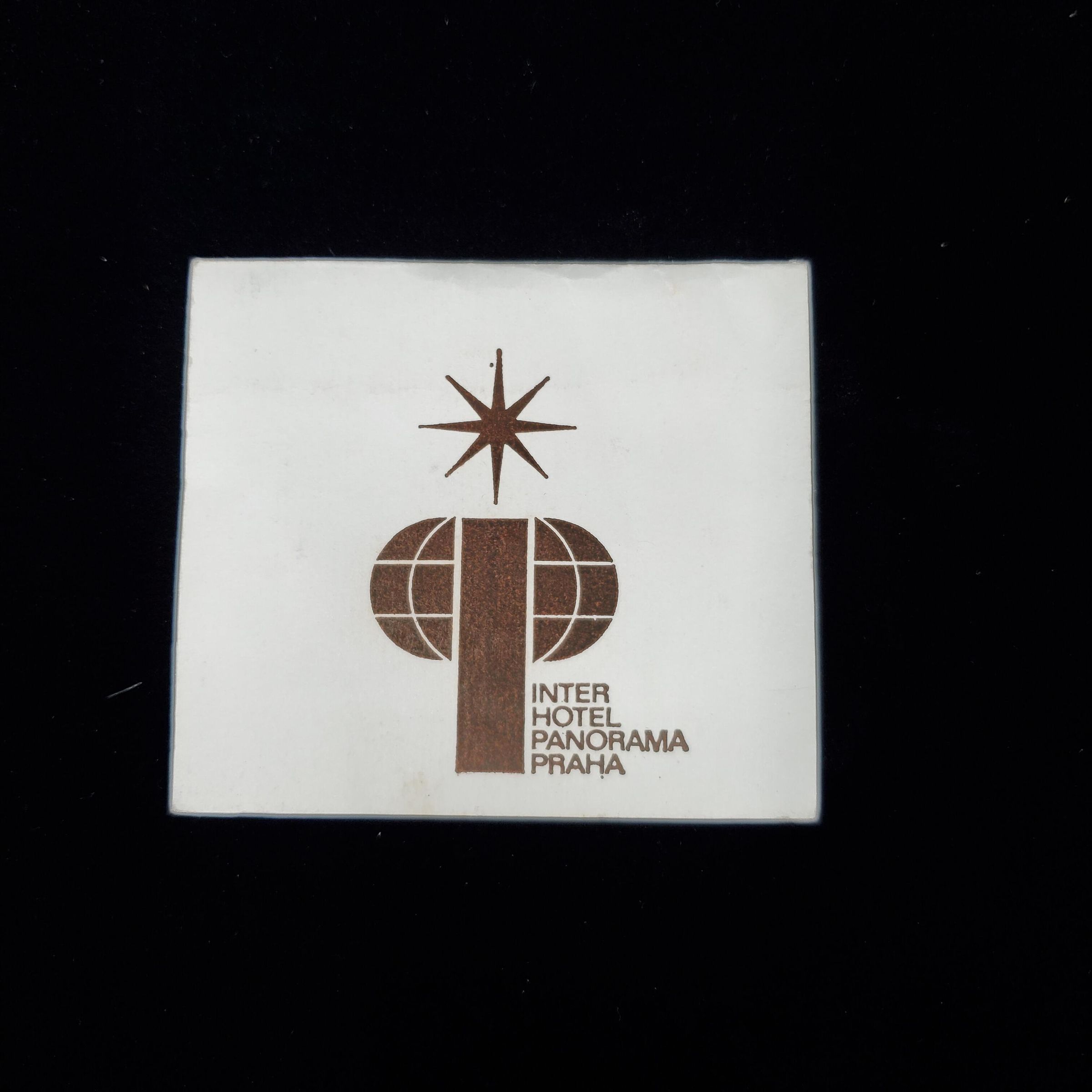 Souvenir Advertising sewing kit. Match folder type, white with brown colours. Outside cover has logo and printÓInter Hotel Panorama PrahaÓ(Prague). Back plain. Inside plastic envelope with cards of threads needles, pins and buttons.