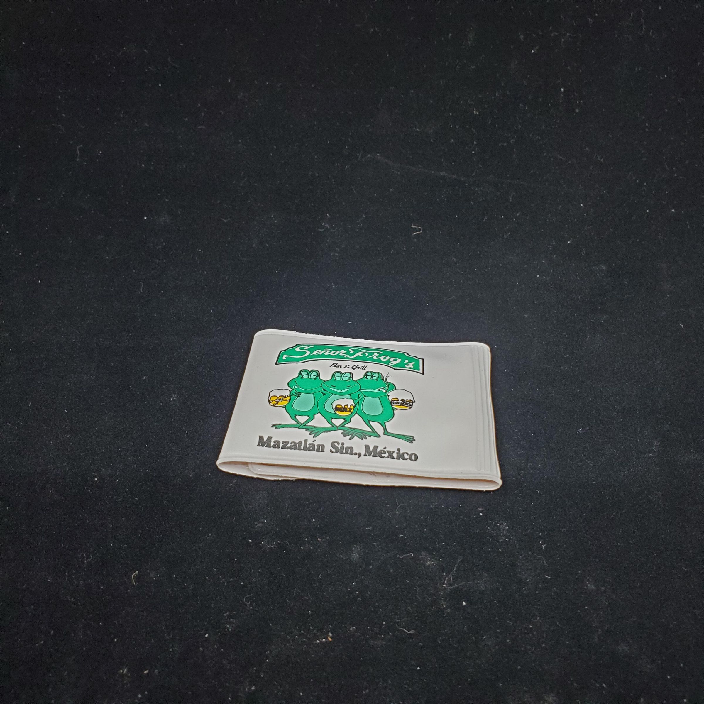 Plastic souvenir sewing kit. White, green and yellow. Folding type. Advertising on front cover with logo for ÒSenor FrogÕs Bar & Grill Mazatlan Sin, MexicoÓ Inside under clearplastic 2 carboard rolls of threads, 2 needles, 2.pins, 2 buttons.