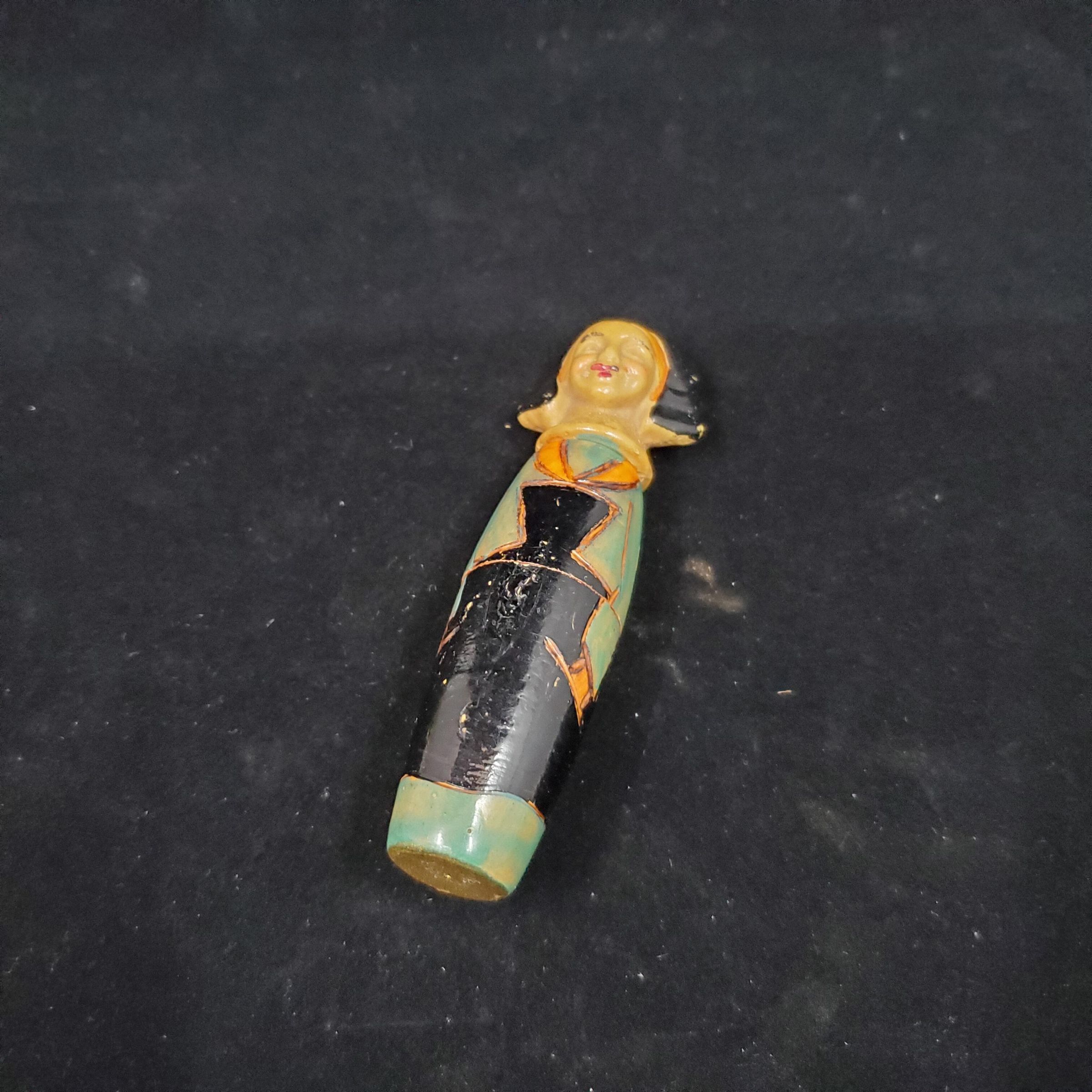 Painted early plastic (celluloid) sewing kit in the shape of a nun or county woman. Colours mainly green, black and orange.Inside gold coloured 3 thread bobbin with inside for needles and plain silver coloured thimble Size 5 thimble. No marks.