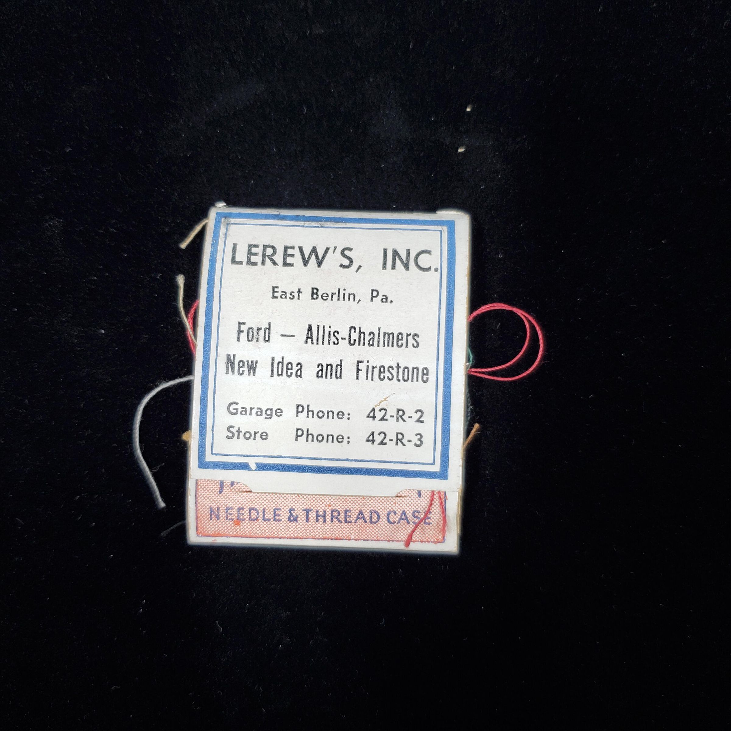 Cardboard match folder type Advertising Needle and Thread case. Whte , red, blue and black colours. One side ÒLerewÕs Inc. East Berlin, Pa. Ford Allis-Chalmers New Idea & Firestone :Ó Other side very decorative silhouette with frame and spangles. Inside card of threads with needle.