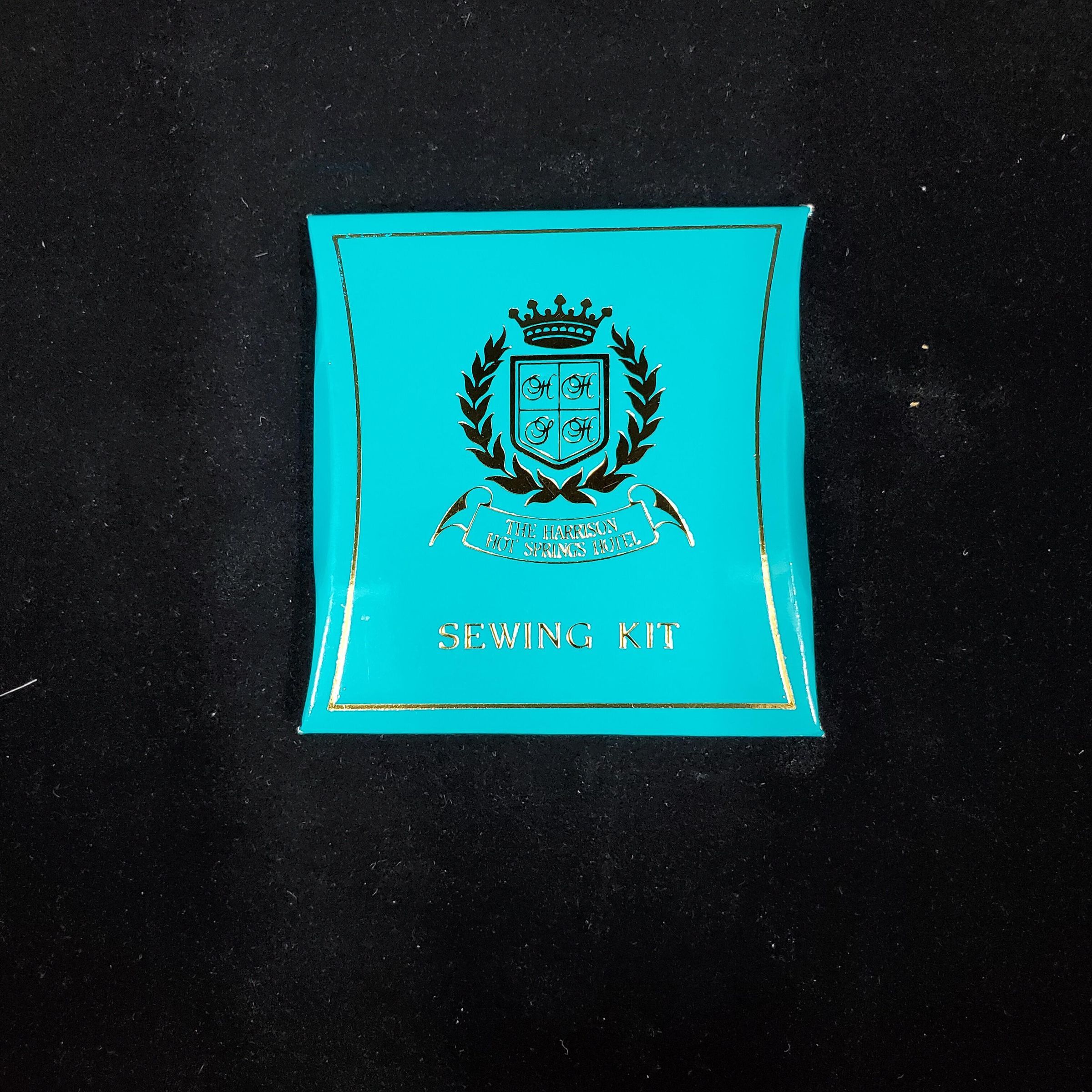 Envelope rtpe Advertising sewing kit. Green with gold.Logo on front cover with Ò The Harrisin Hot Springs Hotel Sewing KitÓ. Back plain. Inside plastic envelope with card of threads, pin,,needle and buttons.