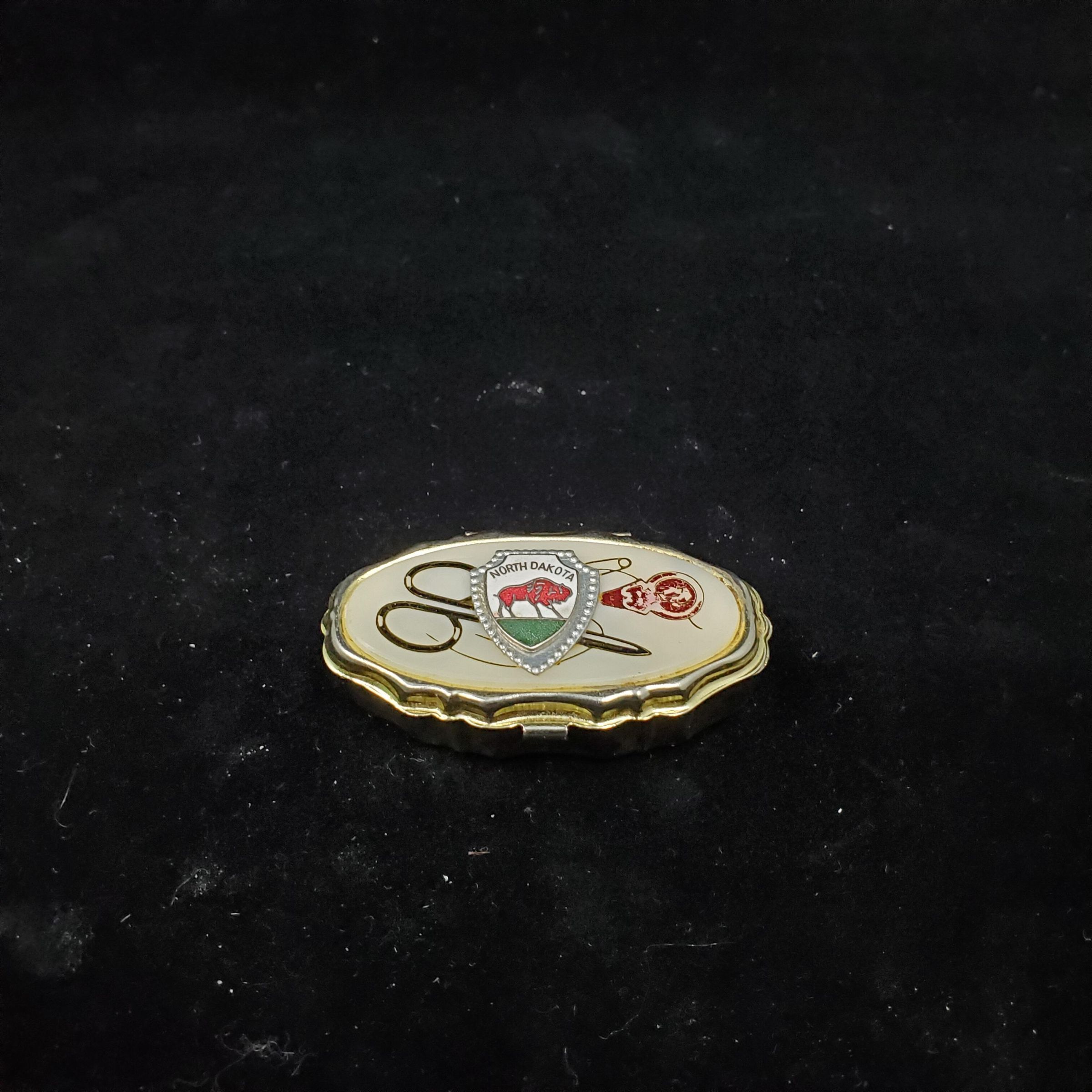 Oval gold coloured metal sewing kit. On top a picture of scissors,needle threader, thread, pin, with a shield shaped crest on top., Crest of the state of North Dakota. Inside case, needle threader and plastic bobbin for thread and needles.