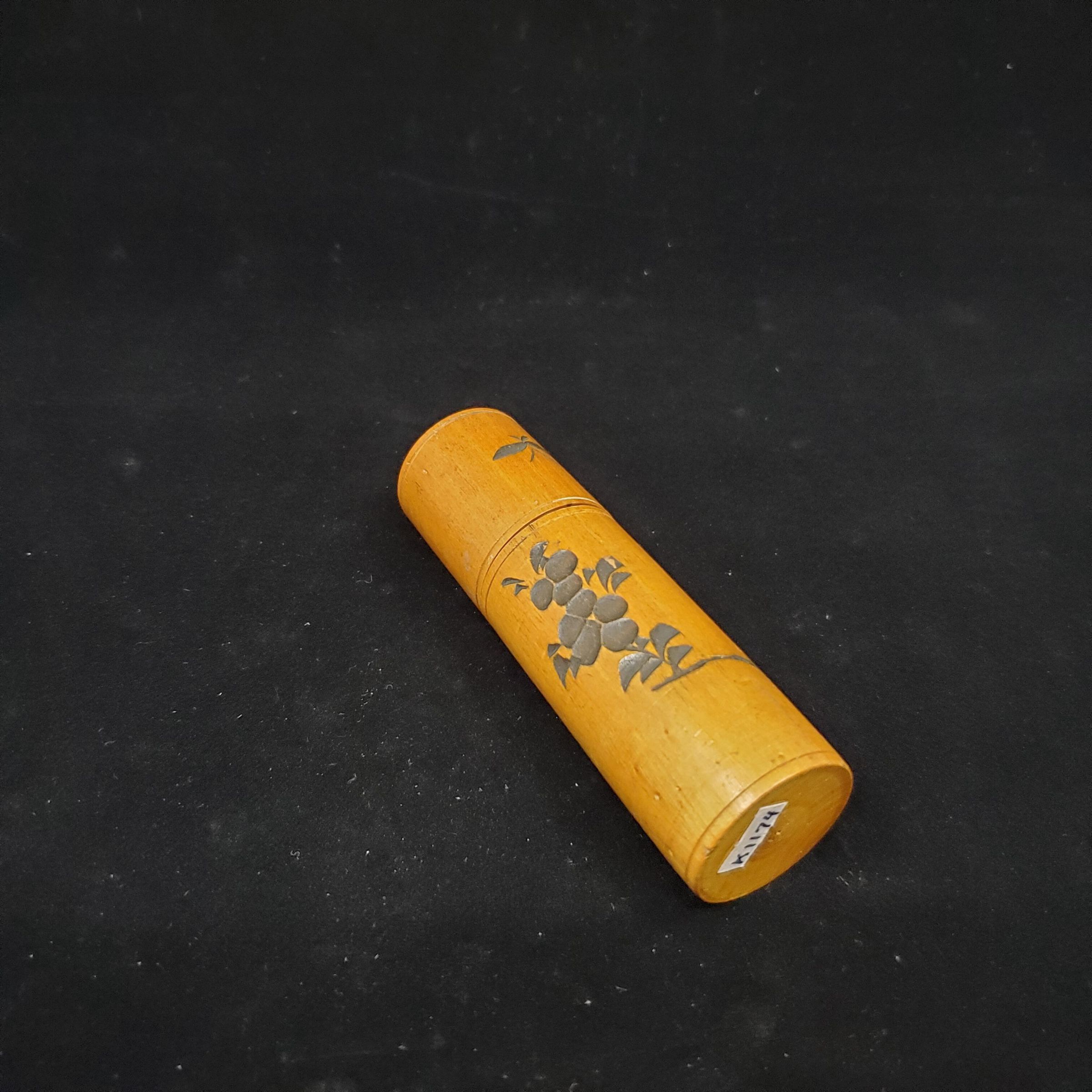 Wooden sewing kit. Souvenir. Medium brown colour with Oriental design in black on top of case. Design incised of fruit and leaves on branch on side in black also. Printing on top of case in black reads ÒLake Placid ClubÓ Inside wooden bobbin, 4 sections for thread-center area for needles - no top.