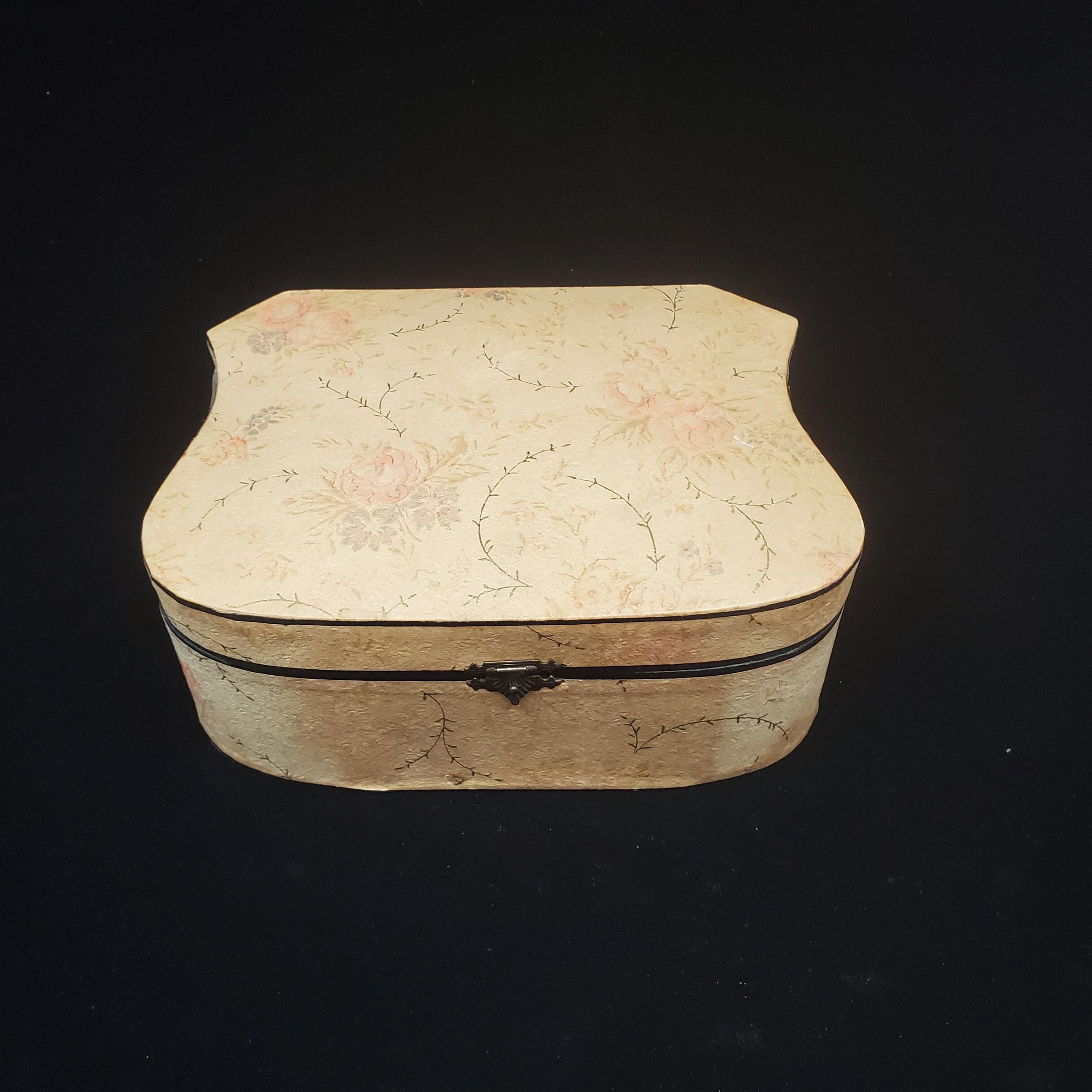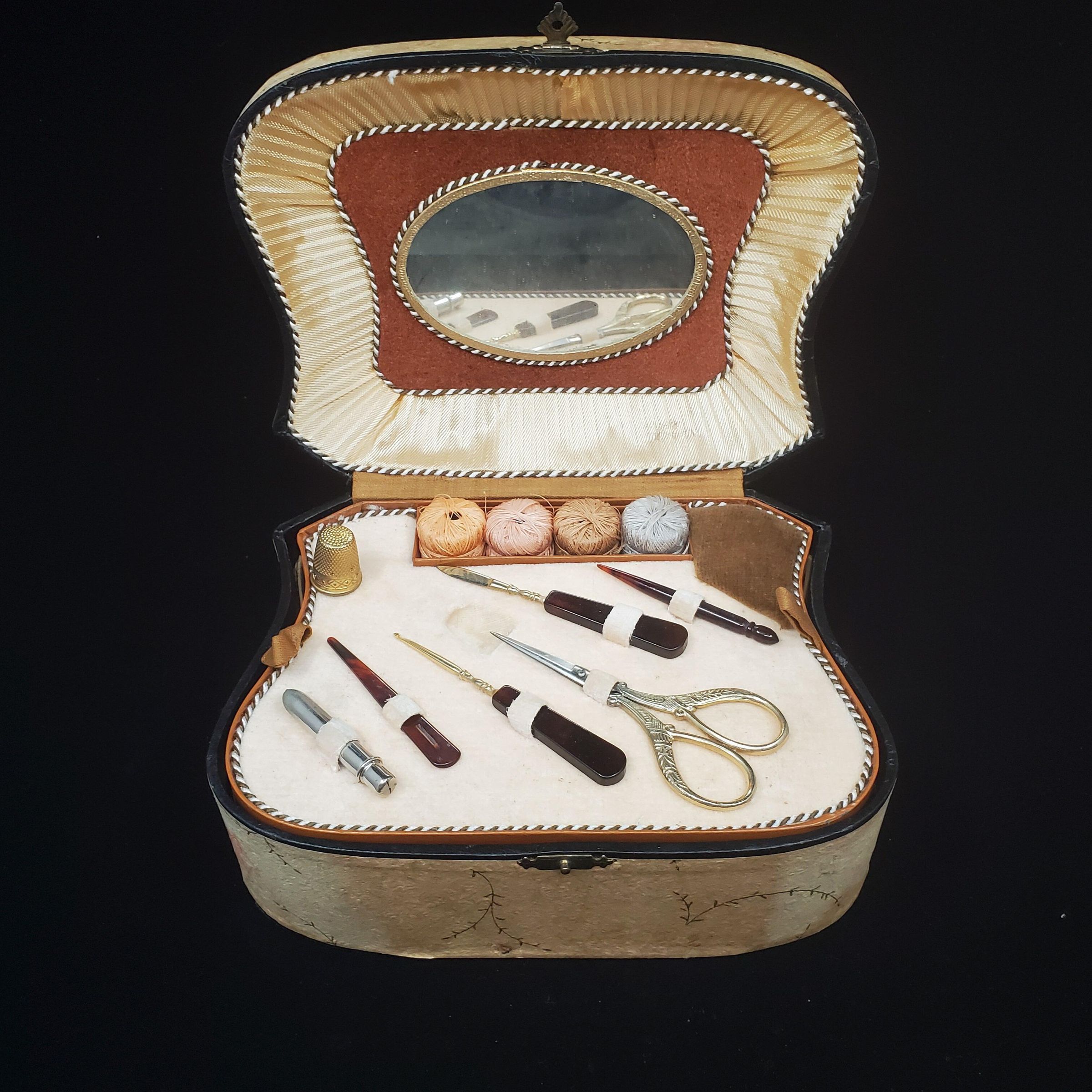 Pale yellow cloth covered box with red & gray flowers. Brass fittings.Inside top has mirror.Top tray removeable. Contains tools -scissors brown bakelite handled hook, bakelite punch, nail cleaner, bodkin, gray steel needle holder, 4 spools mending cotton, brown velvet pincushion in one corner, gold coloured metal thimble with dot, diamond pattern. Lower empty.