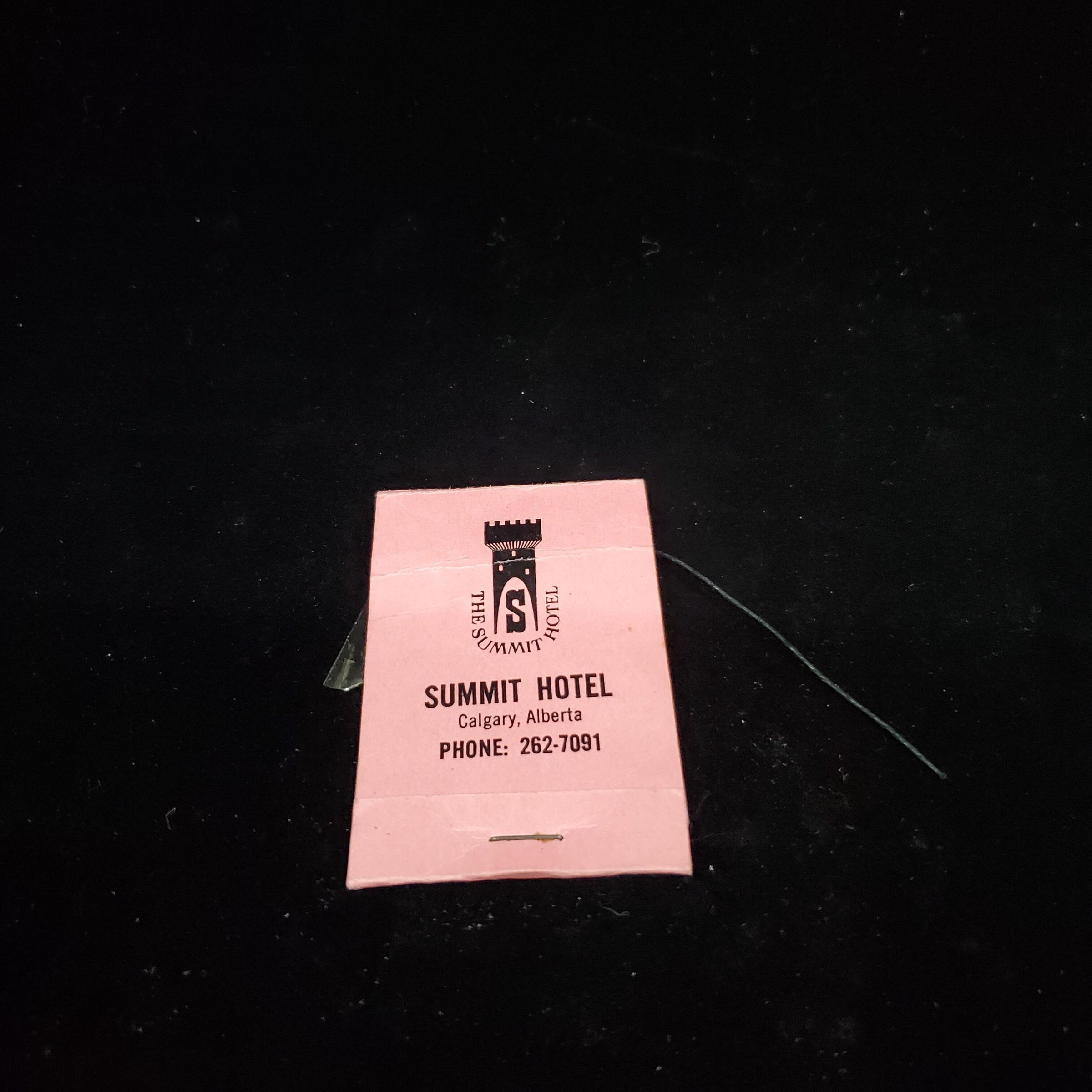 Cardboard match folder type Advertising sewing kit. Colurs pink and black. Front cover has logo with ÒThe Summit Hotel and Summit Hotel Calgary, Alberta Phone 262-7091. Back plain. Inside plastic envelope with card of threads and needle, pin and buttons.