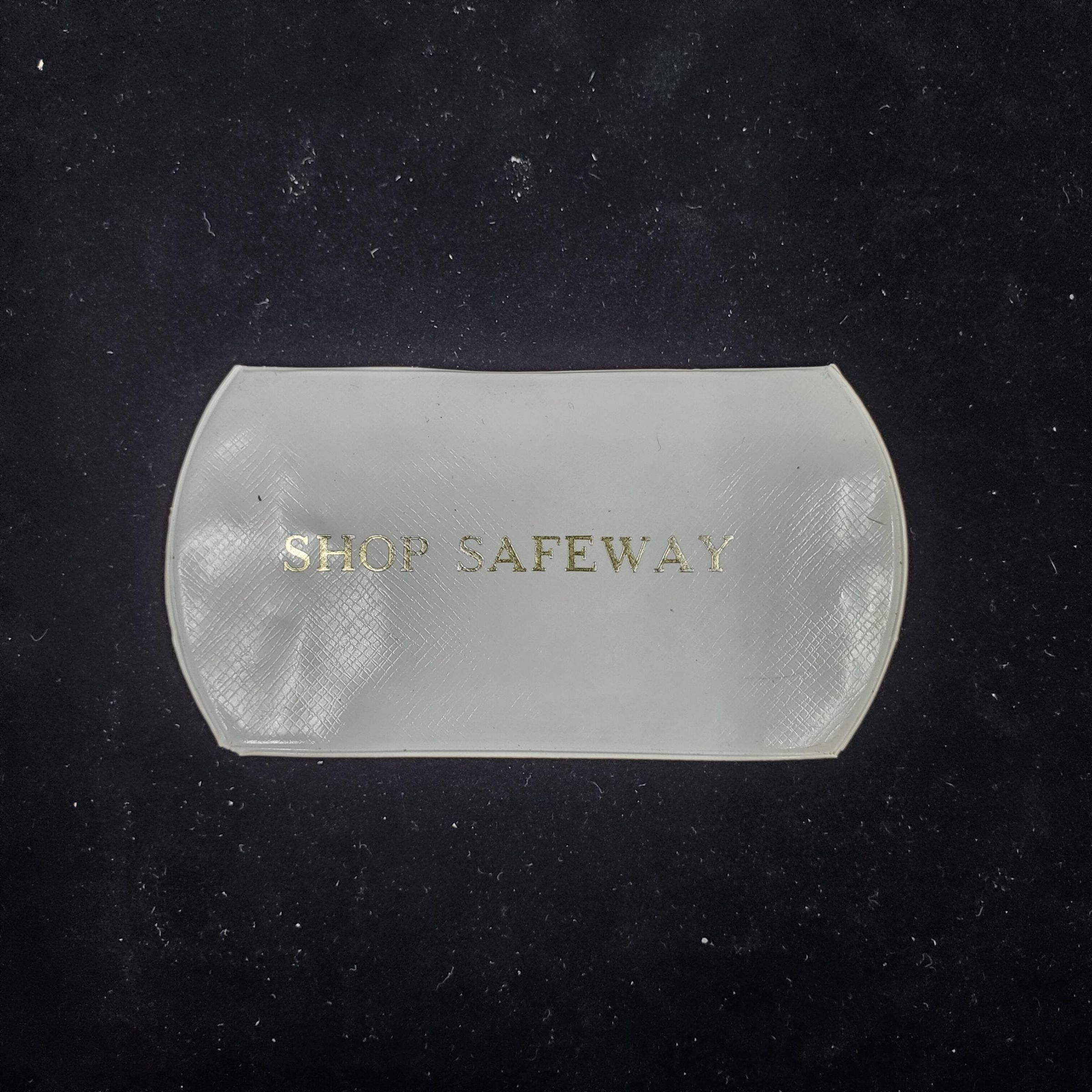 White folding plastic Advertising sewing kit. Silver printing advertising ÒShop SafewayÓ. on front cover. Opens book style.White plastic back. Inside - carboard of coloured threads one side with needles. Other side has needle threader.