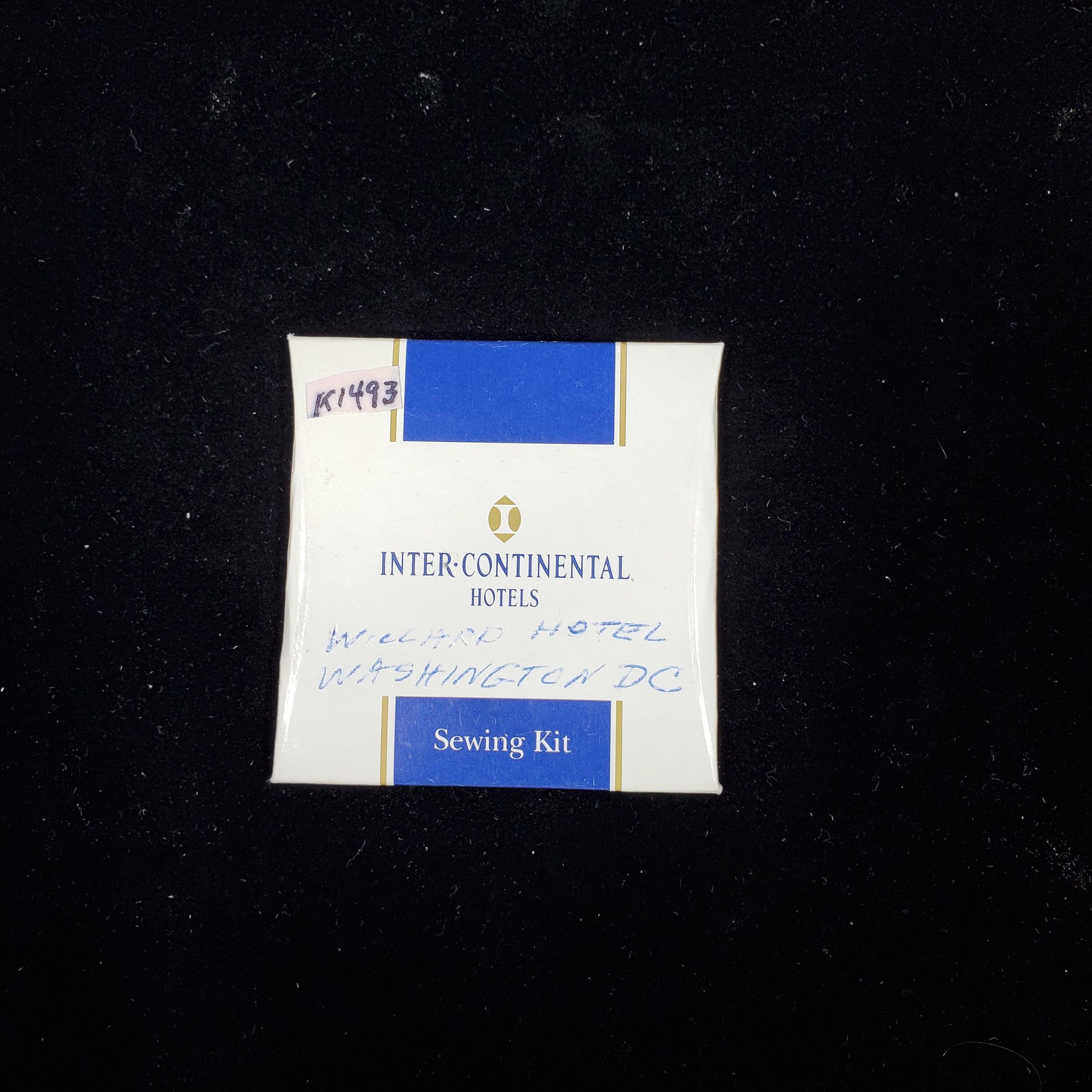 Match folder type sewing kit.White and navy blue colours. Intercontinental Hotels kit left in hotel rooms. This one in the Willard Hotel, Washington, D.C. Inside olastic envelope with card of coloured threads, pin, buttons, needle.
