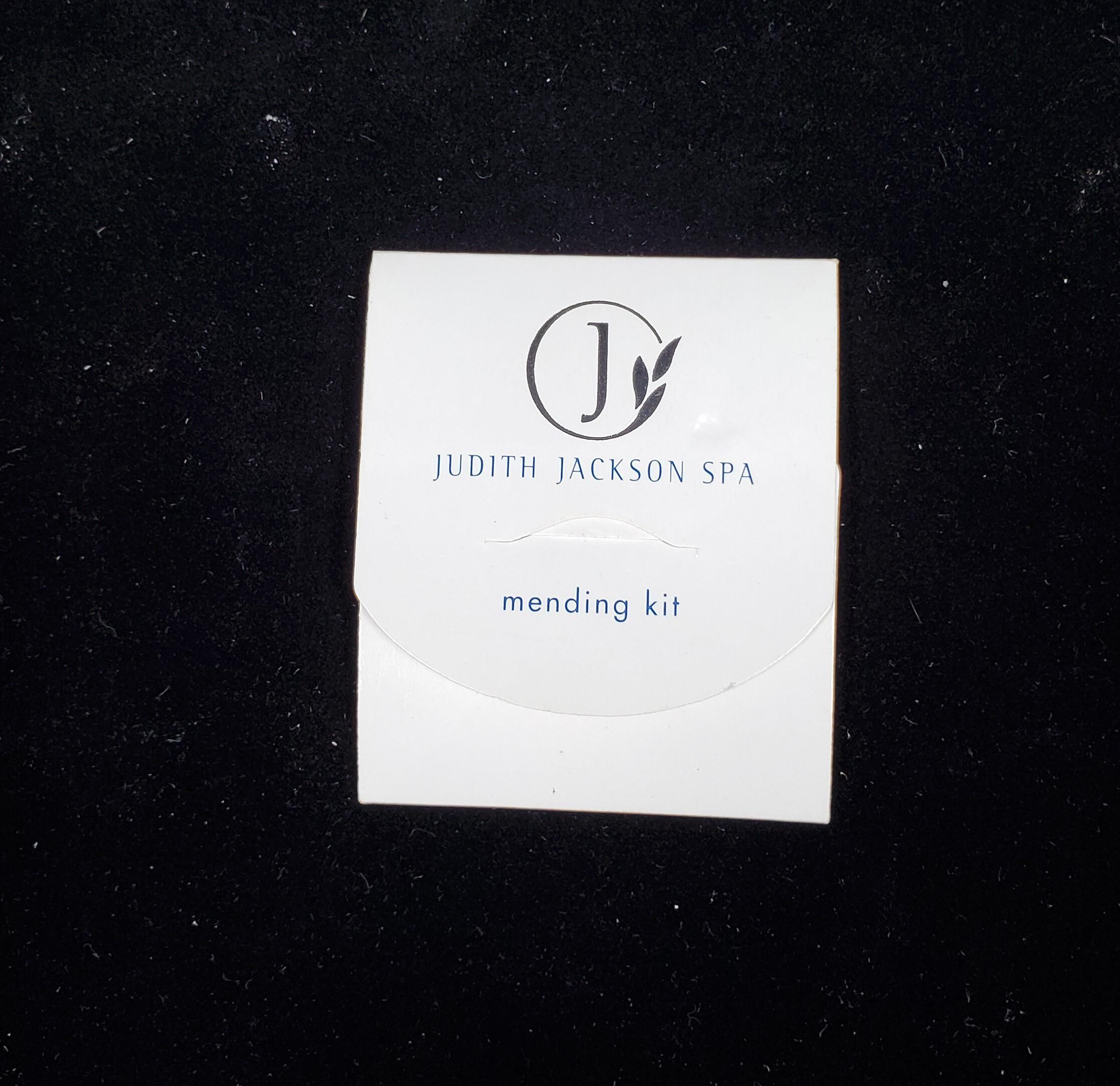 Mending Kit, match folder type. White with blue and silver. On cover ÒJ Òin circle with leaves in silver colour. ÒJudith Jackson Spa Mending KitÓ in blue print. Inside plastic envelope with card of coloured threads, buttons,pin, needles