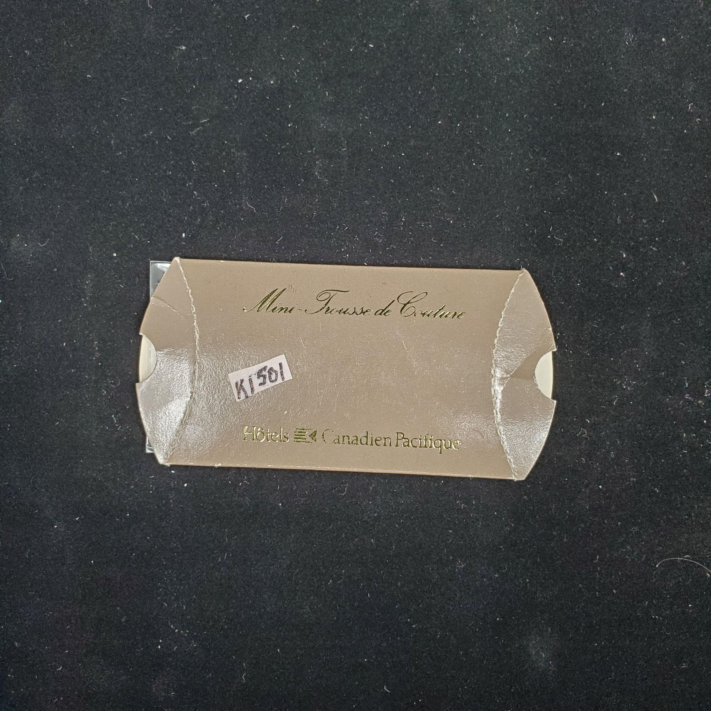 Sewing Kit. Light brown box with gold printing in French and English. ÒSewing Kit Canadian Pacific HotelsÓ Inside plastic envelope with card of coloured threads, buttons, pin, needle, needle threader.