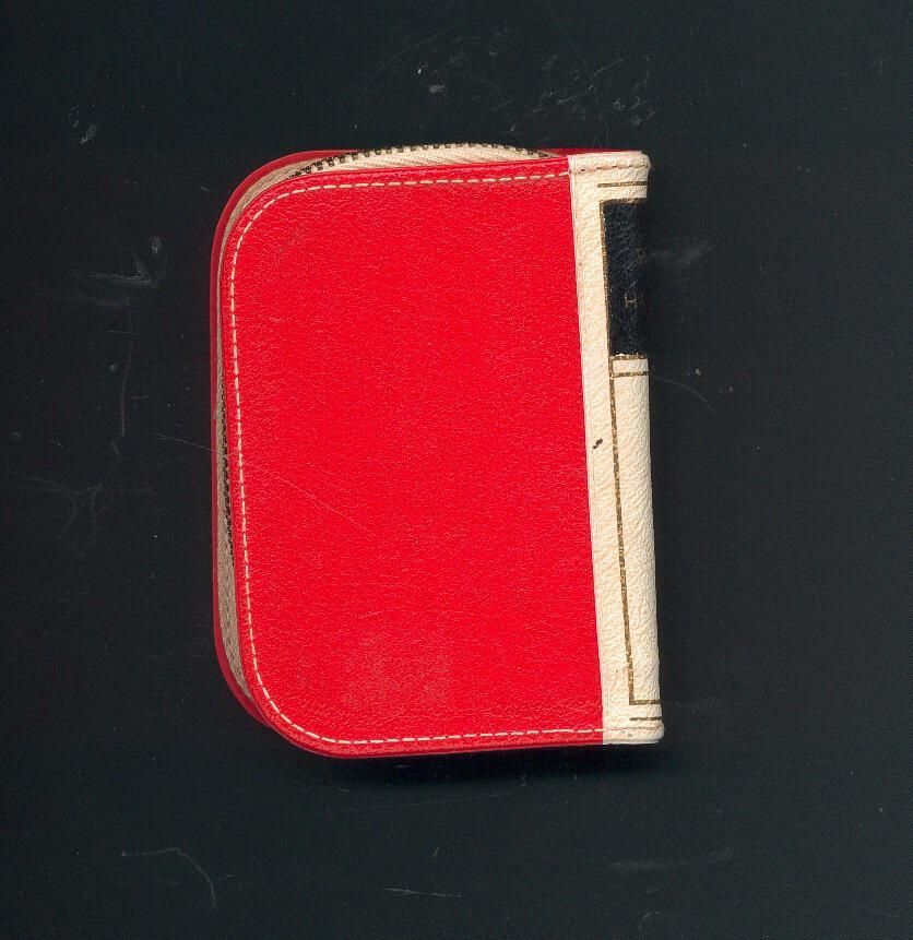 Sewing Handbook - red and cream coloured zippered case in shape of book with title. Inside - safety pins, tape, threader and needles