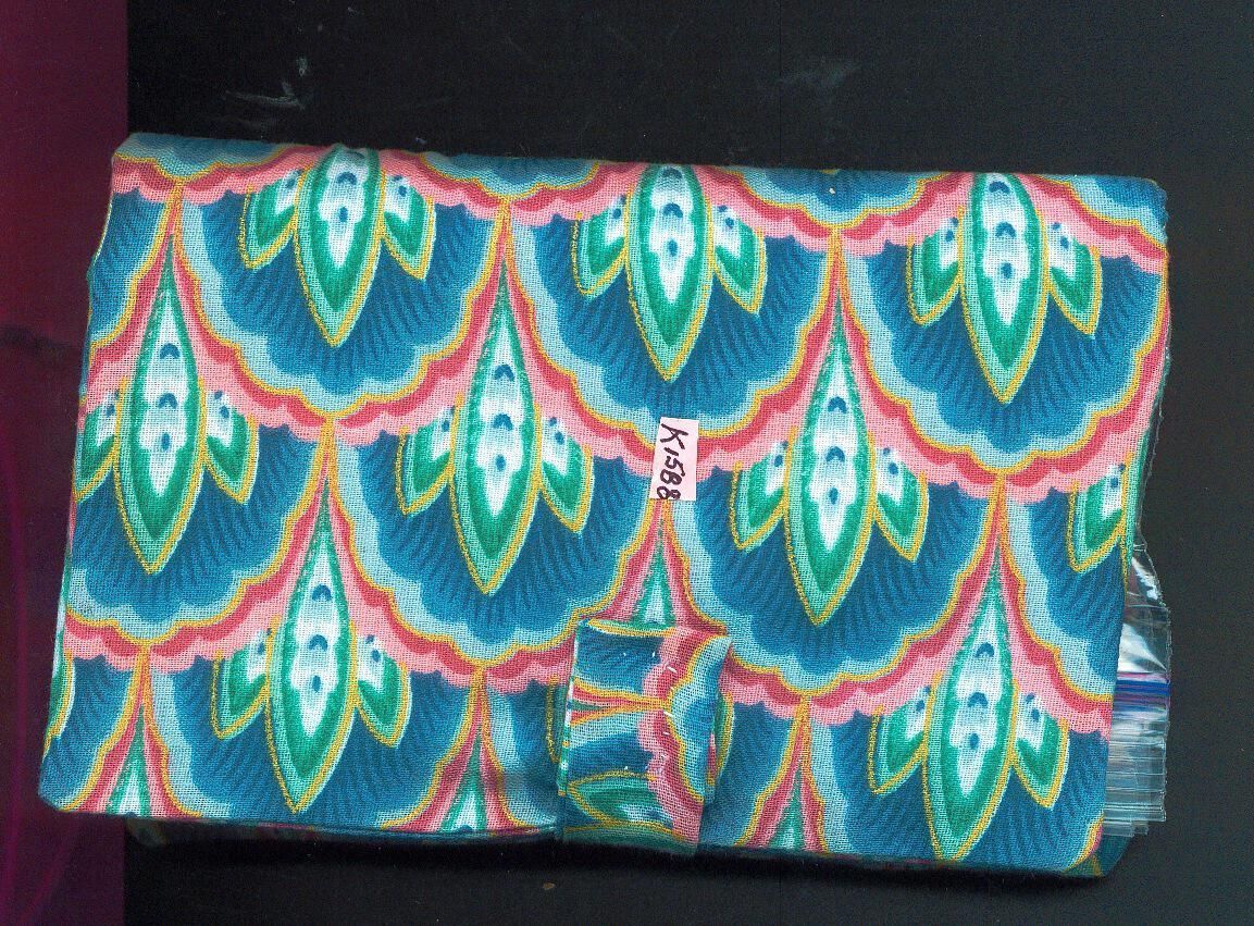 Cloth foldover sewing kit with Velcro closure. Hand sewn. Inside 4 plastic envelopes with sewing tools - tape, threads, needles, thimble, etc. Pattern on cloth in blue, red, beige and gold.
