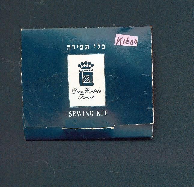 Match Folder type of sewing kit with small scissors,buttons, threads,pins and needle.Outside reads Sewing Kit Dan Hotels Israel with logo.
