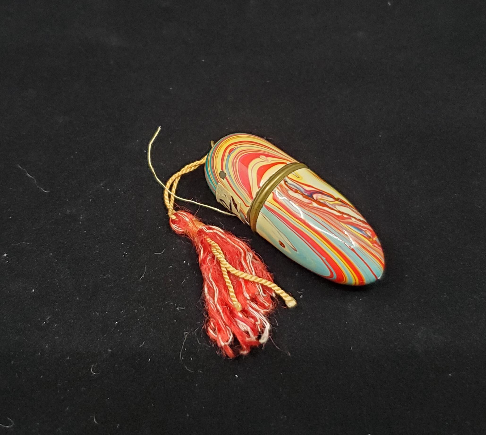 Coloured mottled enamel bullet shaped sewing kit. Colours mailnly blues and red. with red and white tassel from top. Inside orange plastic 2 thread bobbin with brass top for the needle case part. Thimble included. Stamped Made in Germany on lower part of case. Thimble - 3 tiered brass thimble. Raised rim with narrow verticaly lined band above and below a wide plain band. 2 tiers of knurling above with a narrow plain band between. Top flat, knurled.