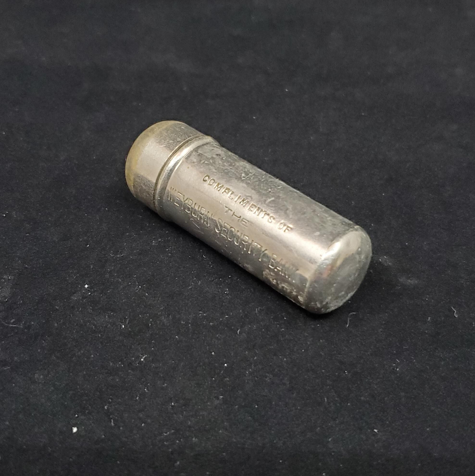 Metal advertising case with 2 thread bobbin inside. Top missing from stem of bobbin - center is for needles, pins etc. Thimble included. Outside of case stamped Ò Compliments of TheWeyburn Security BankÓThimble - Aluminum thimble with plain band at rim stamped with ÒIles AlurineÓ Narrow lined band above then knurling to and over top. Slightly out of round.