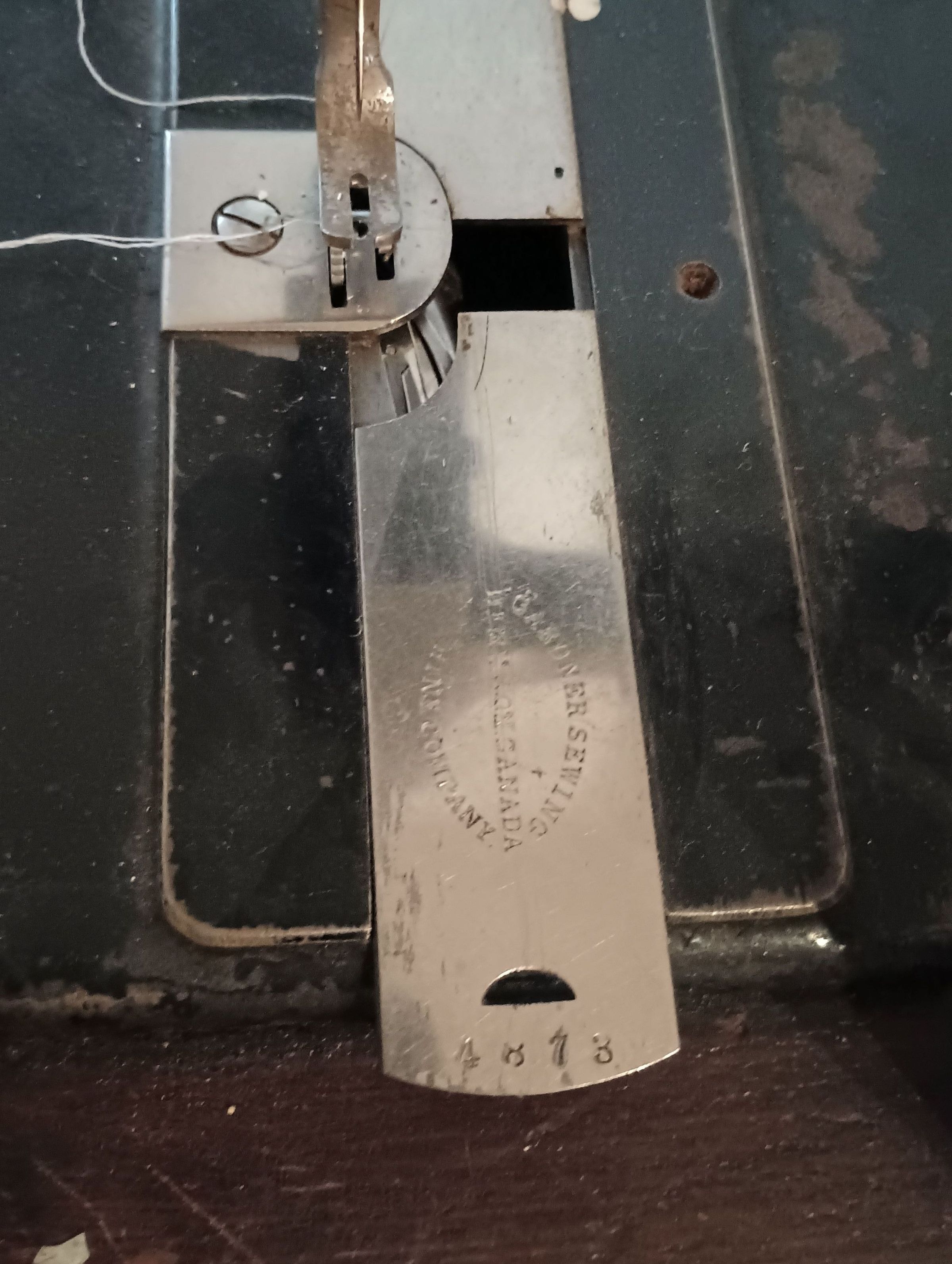 Royal model treadle sewing machine manufactured by Gardner Sewing Machines Hamilton Ontario. 'Gardner Sewing Machine Co. Hamilton Ontario' stamped on front shuttle slide. Royal cast in raised print on the treadle.Context