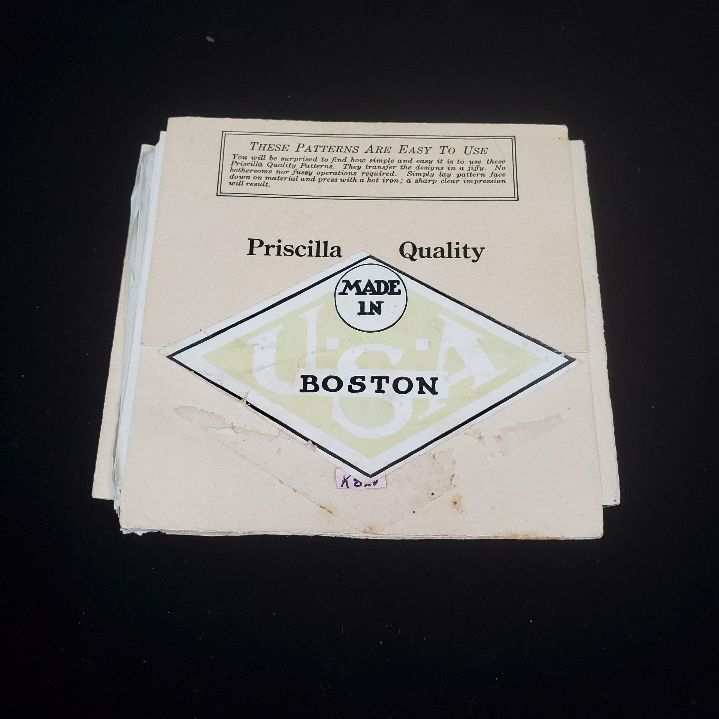 Package of patterns for Initials and designs for embroidery stamping. Incom[plete. Titled ÒPriscilla Initial outfitÓ