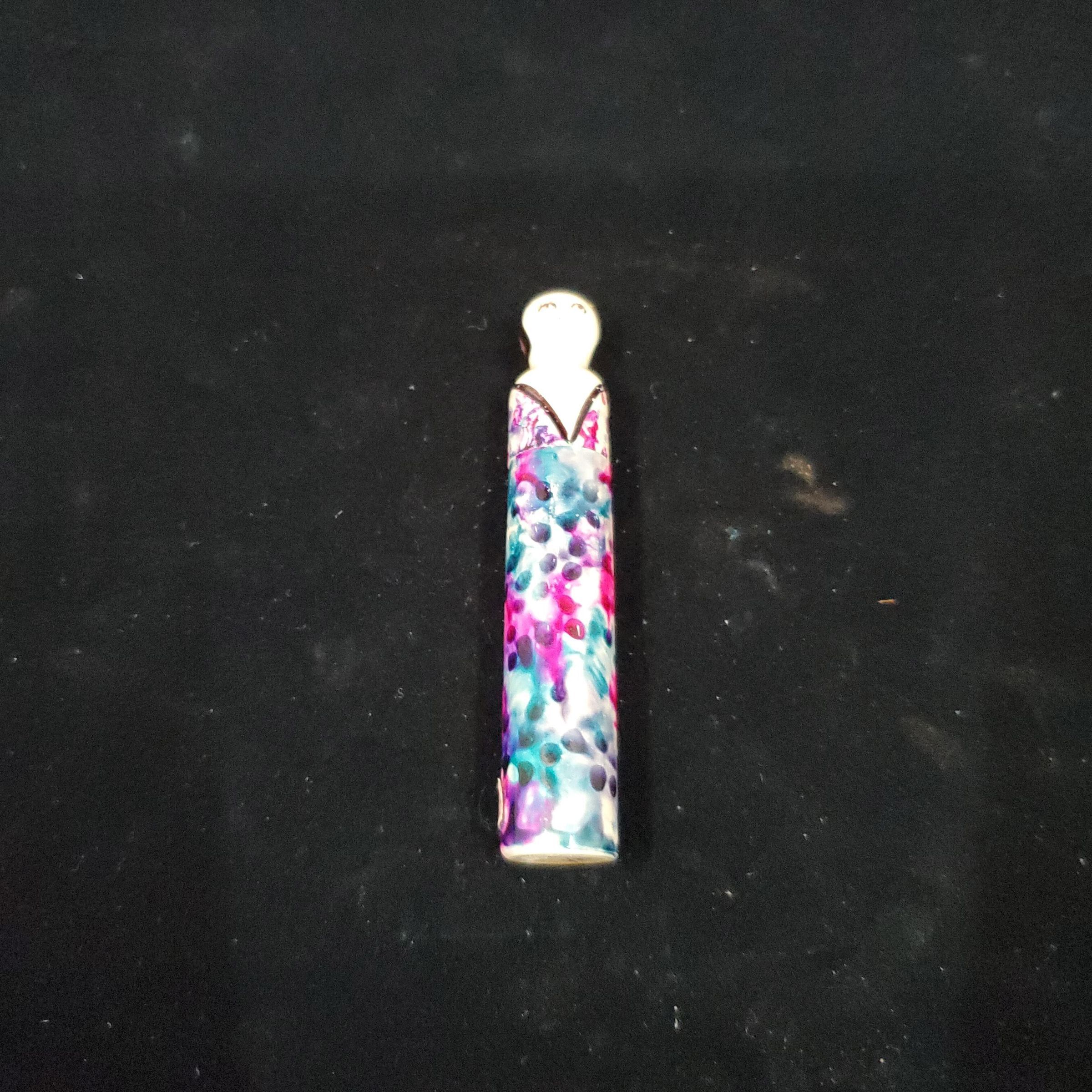 Needle case, early plastic - bakelite or celluloid in shape of woman, black hair, V neck multi-coloured floor length gown. Top and bottom donÕt look like they are matched. In mint condition, never used as is K . 1085 Paper label on bottom with numbers 5214A 6d.