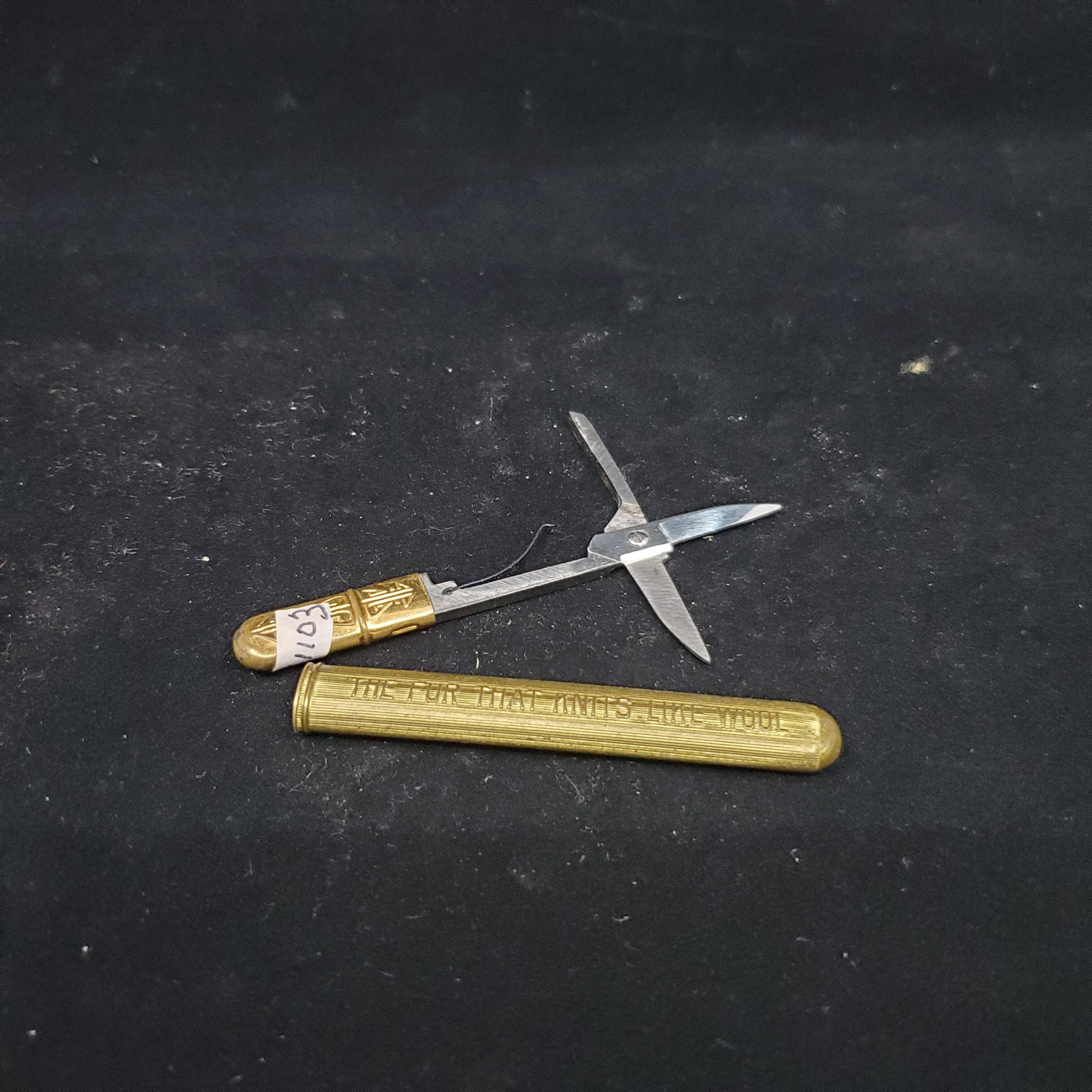 Scissors, Advertising, in brass carrying case. Small end has design on it, larger end has advertising. One side ÒFuridaÓ, other side ÒThe Fur That Knits Like WoolÓ Top end forms handle of scissors which are steel. No marks.