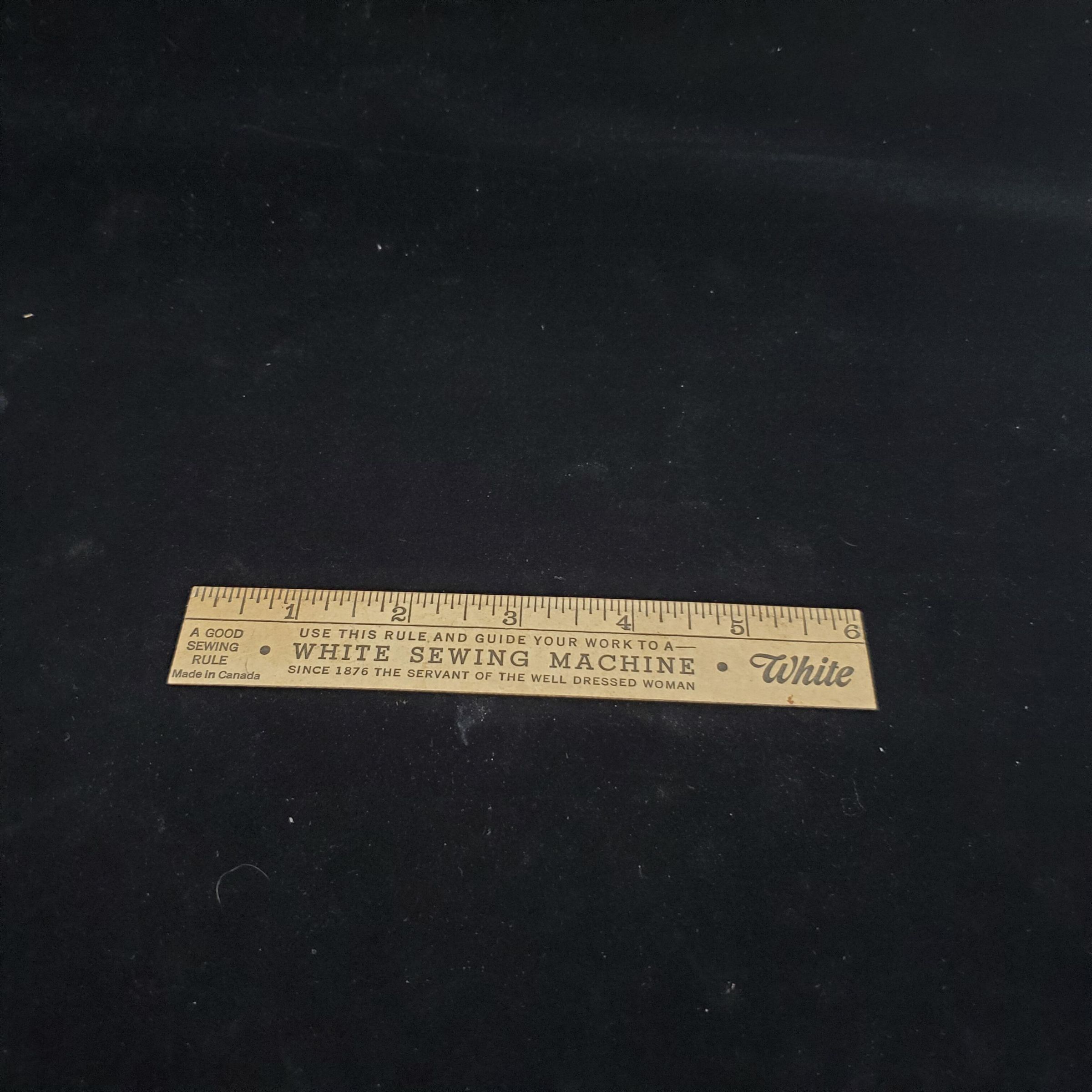 Light tan coloured wooden 6Ó ruler. Advertising. Black printing ÒUse This Rule and Guide Your Work To A White Sewing MachineÓ plus more all on front of ruler. Back blank.