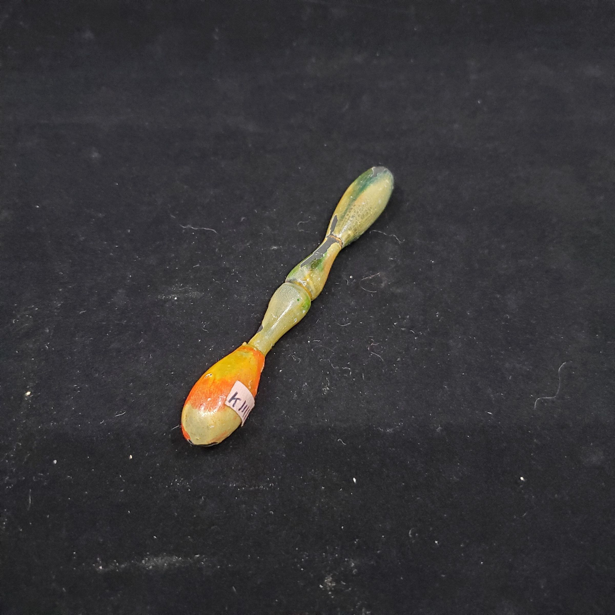 Long wooden glove darner. painted in a variety of colours . Ends are oval -egg shaped - and are od different sizes to accomodate variety of fingers.One end removable but donÕt know why.