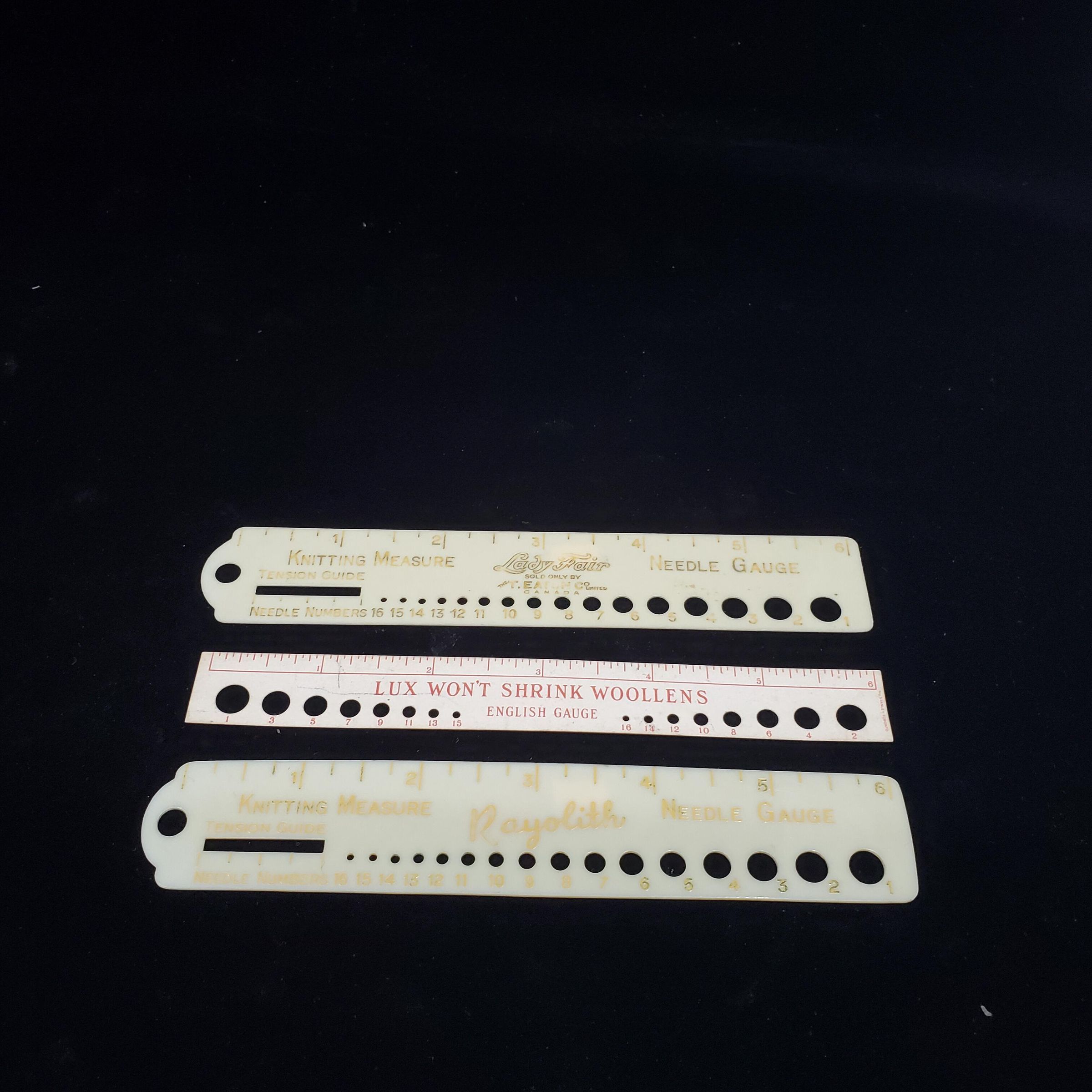 3 plastic knitting needle gauges - all Advertising. 1)Lux - only 3/4Ó wide cream coloured with red print - English gauge.2)Rayolith- heavy cream coloured plastic 1 1/4Ó wide Gold printing Tension guide and needle gauge with holes 3)Lady FairT.EatonCo. -heavy cream plastic, black print. Needle gauge`& tension guide.