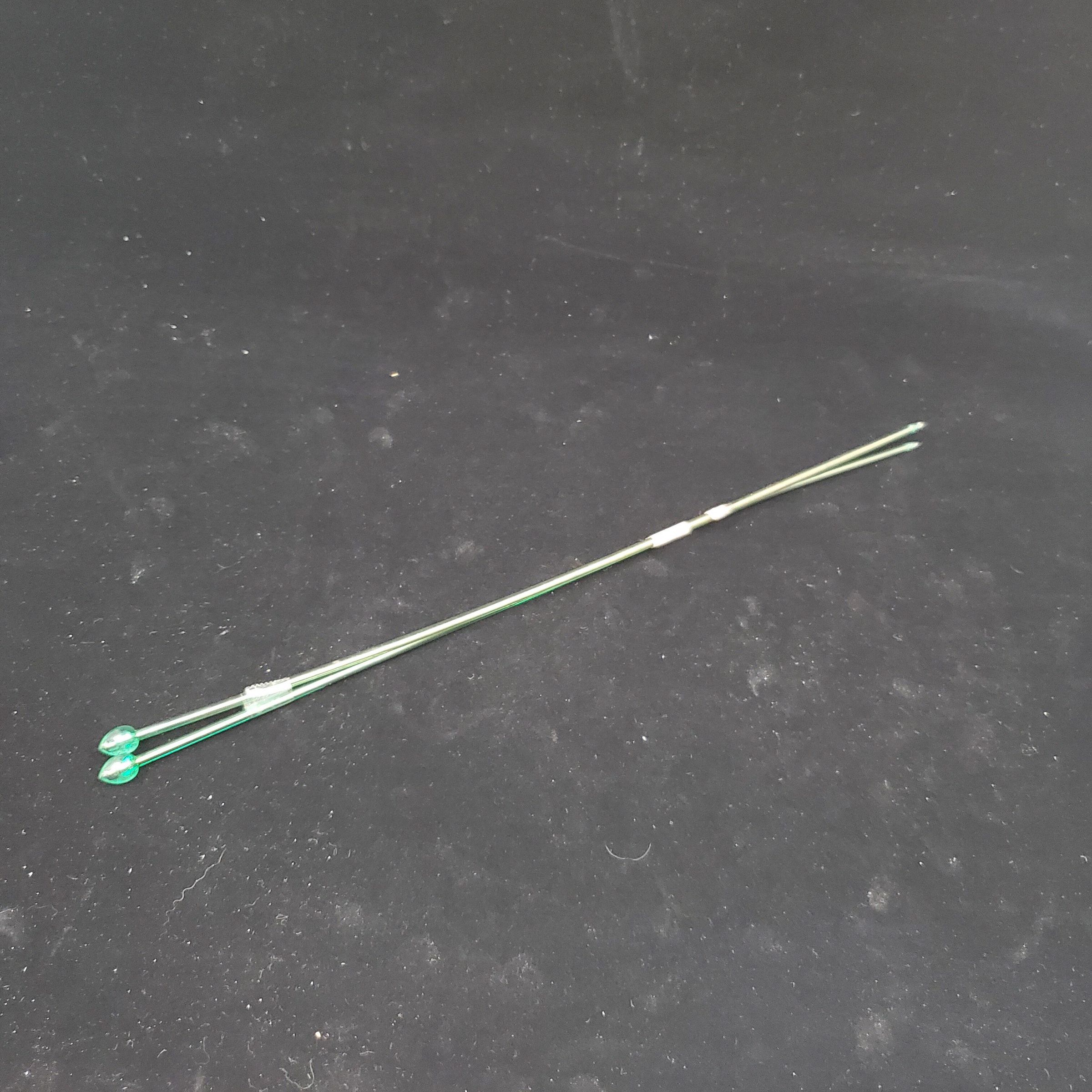 Knitting needles, green with knobs on end. Needles react to magnet so are probably steel with a coating of plastic . Plastic or glass knobs at end, oval shaped.