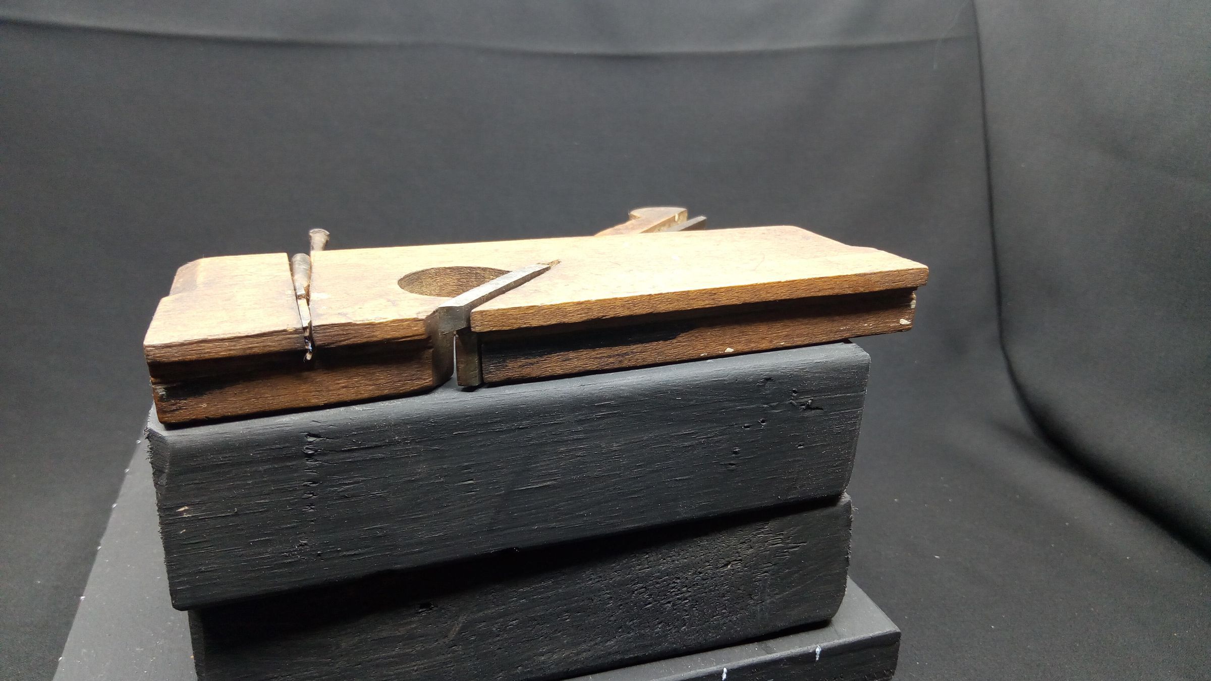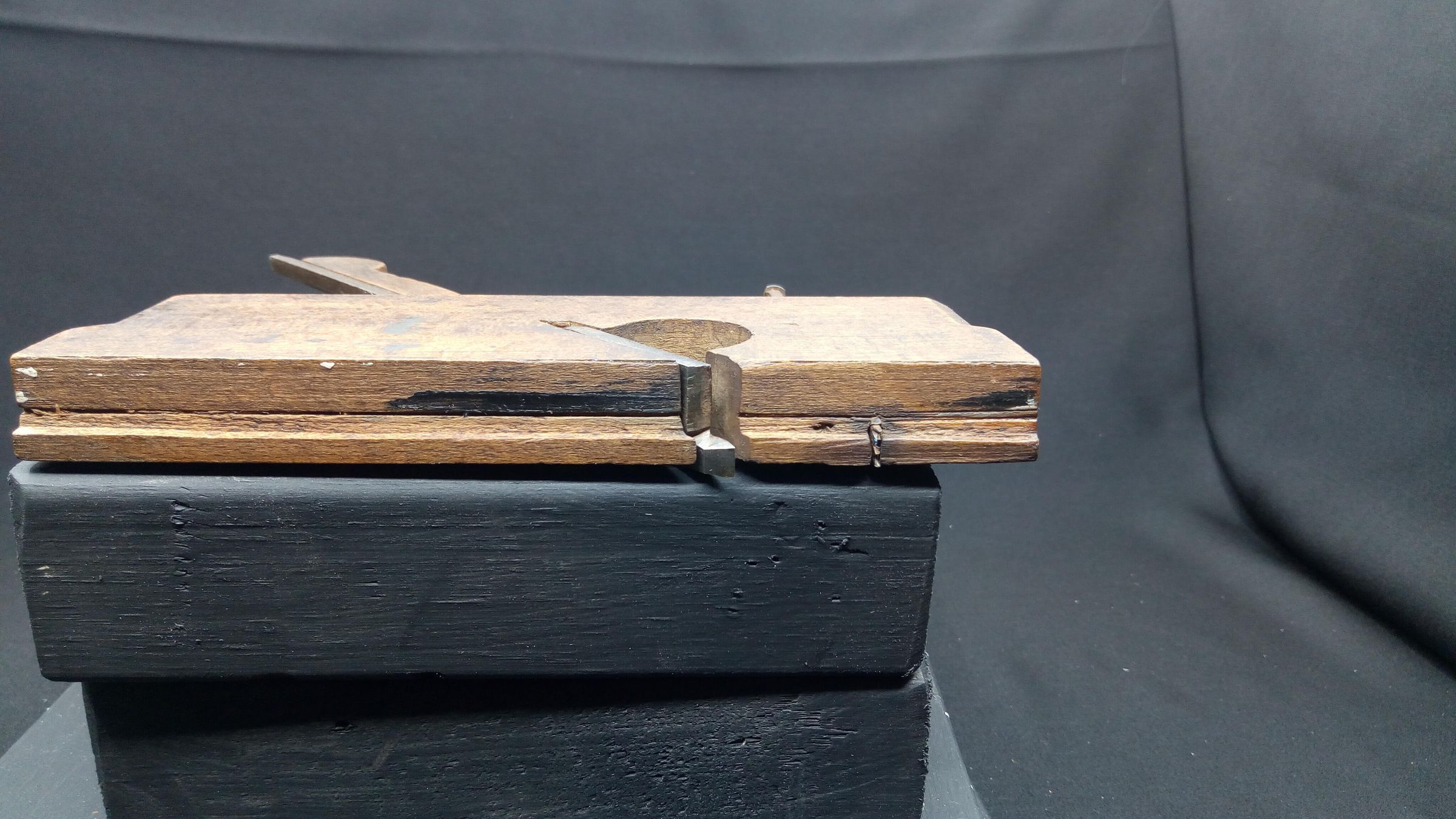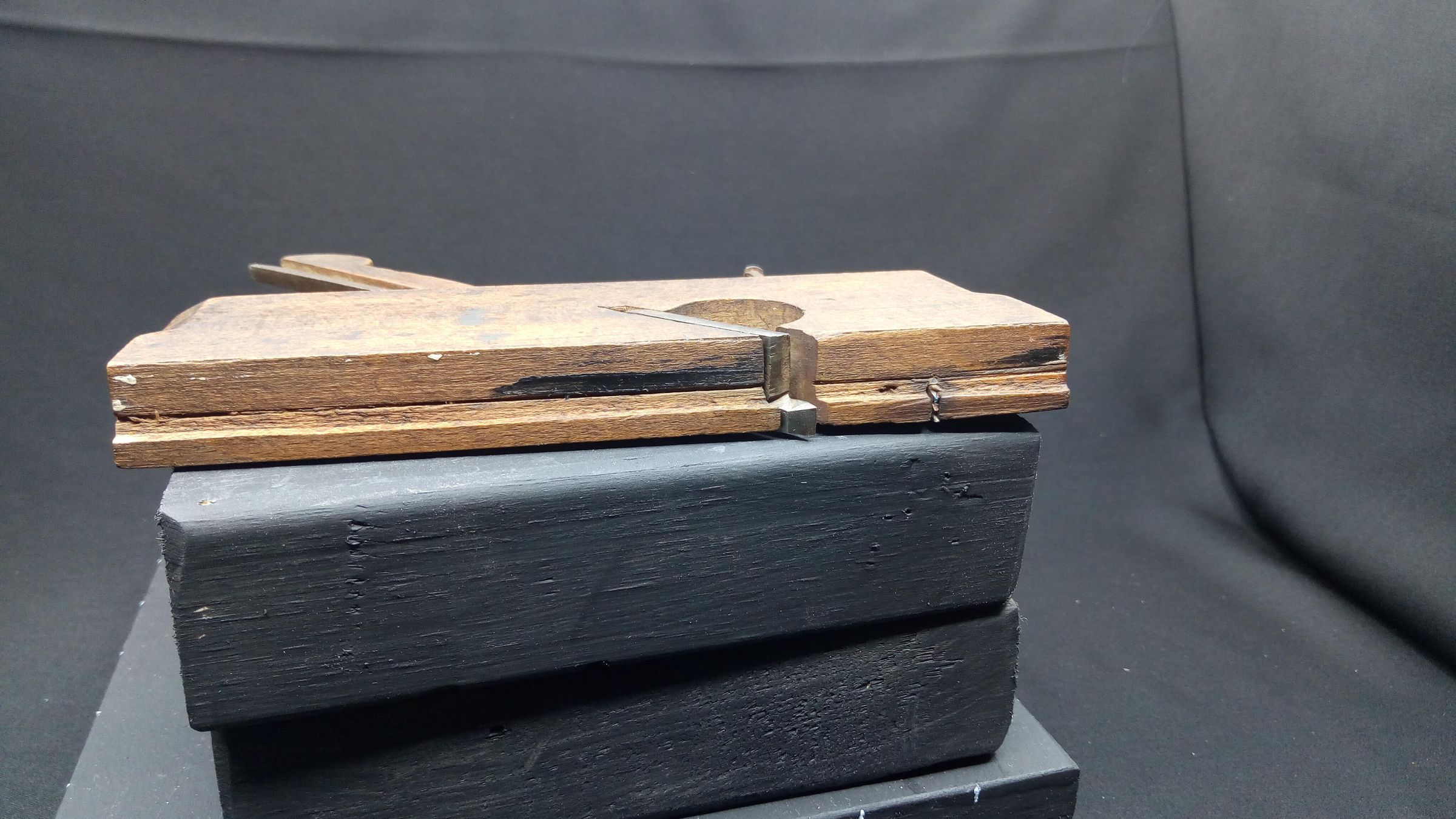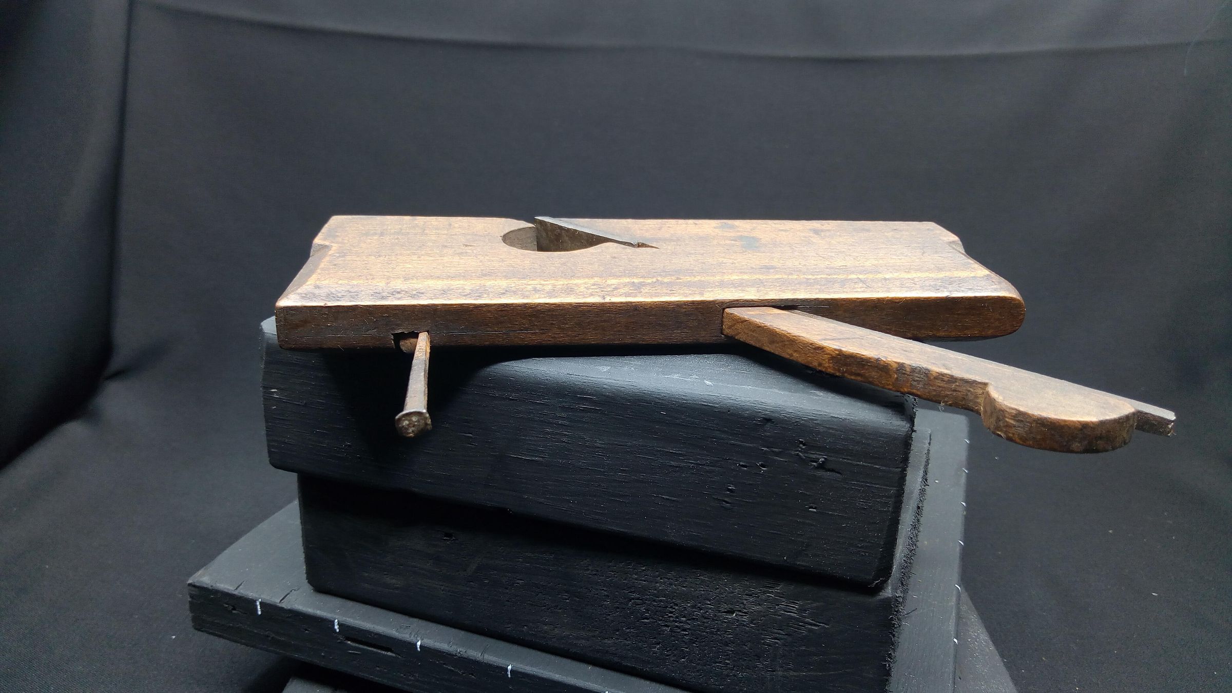 The main blade has been ground from a blade for a larger rebate plane. It is set straight across to avoid the extra complexity of skewing it. The front blade, the nickers, has been ground from a tiny 1/4 inch chisel, and is wedged with an old square cut nail. The body is cleanly shaped and the shaving escape hole very cleanly cut