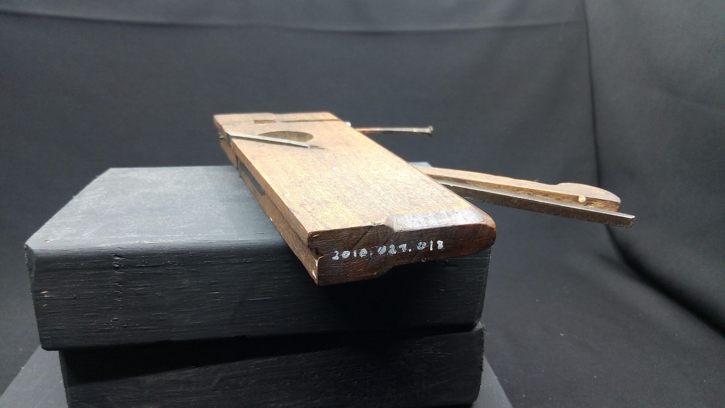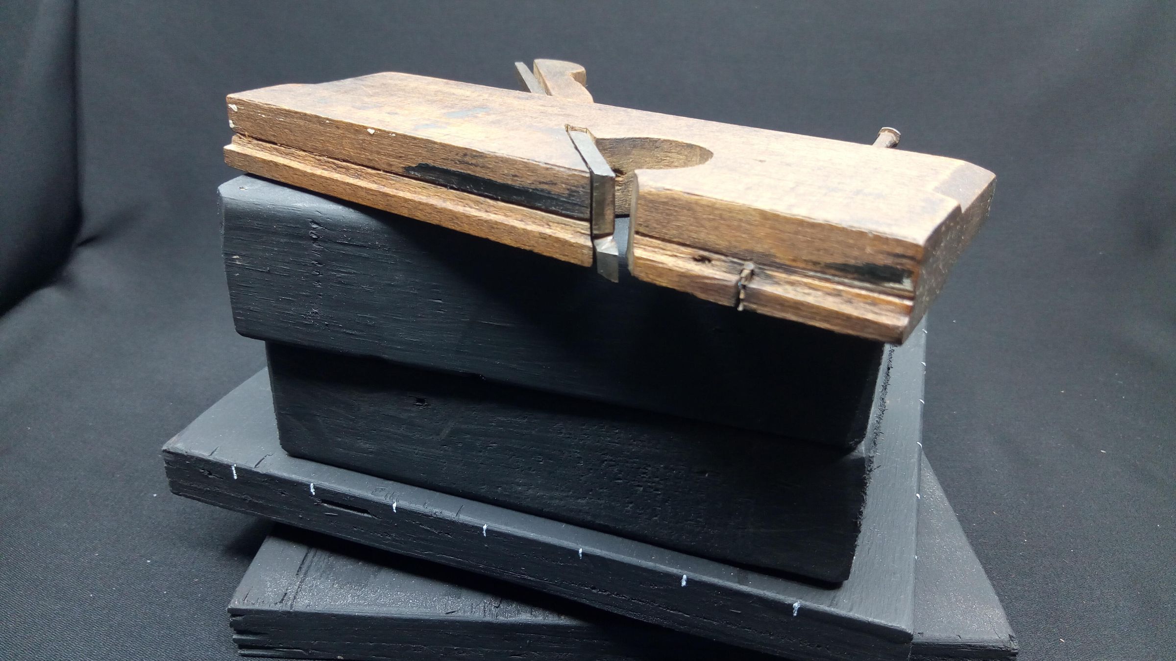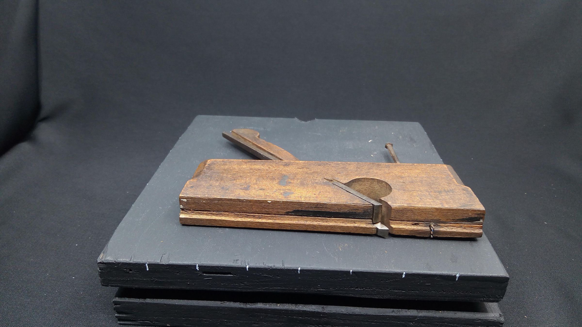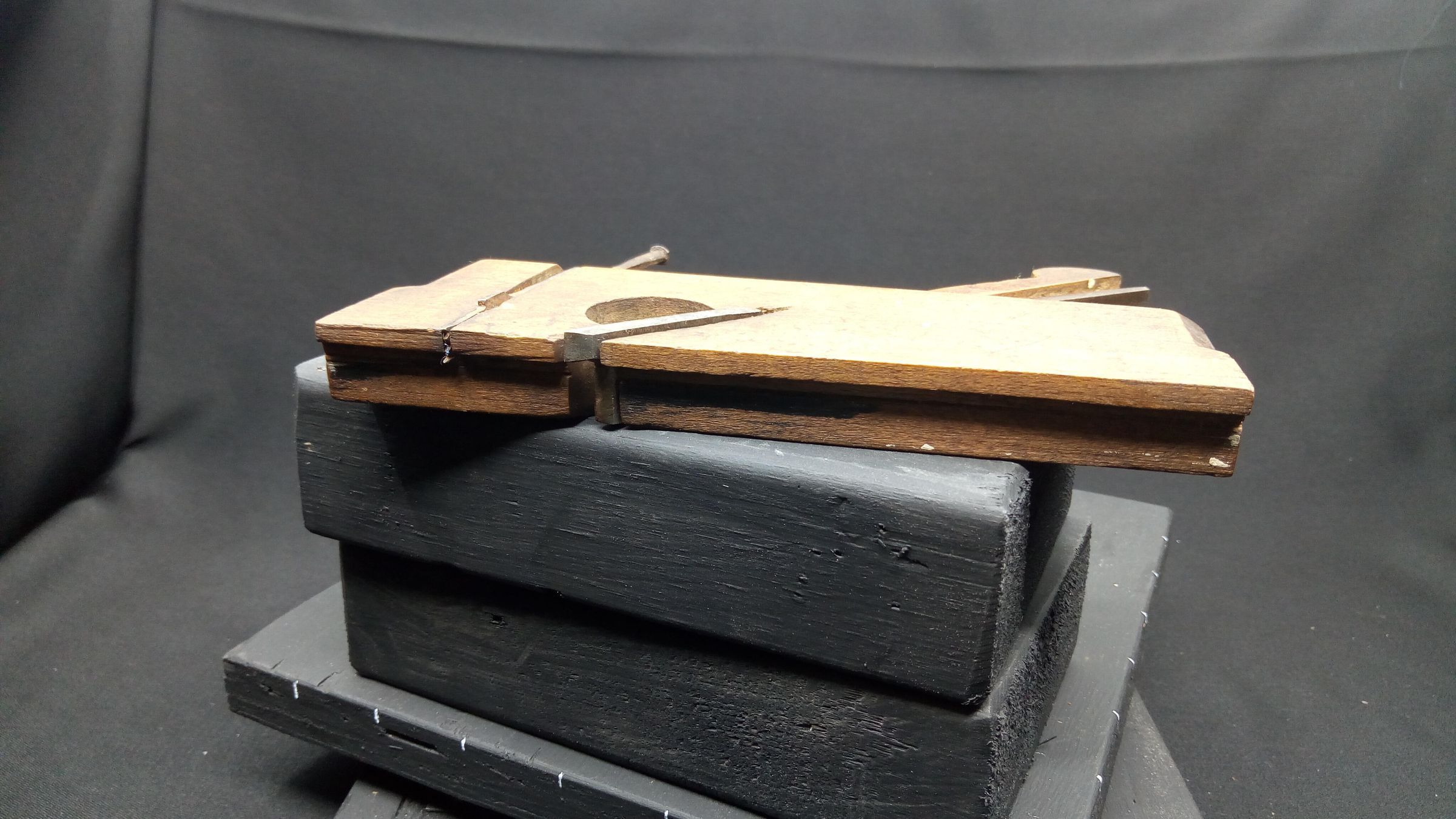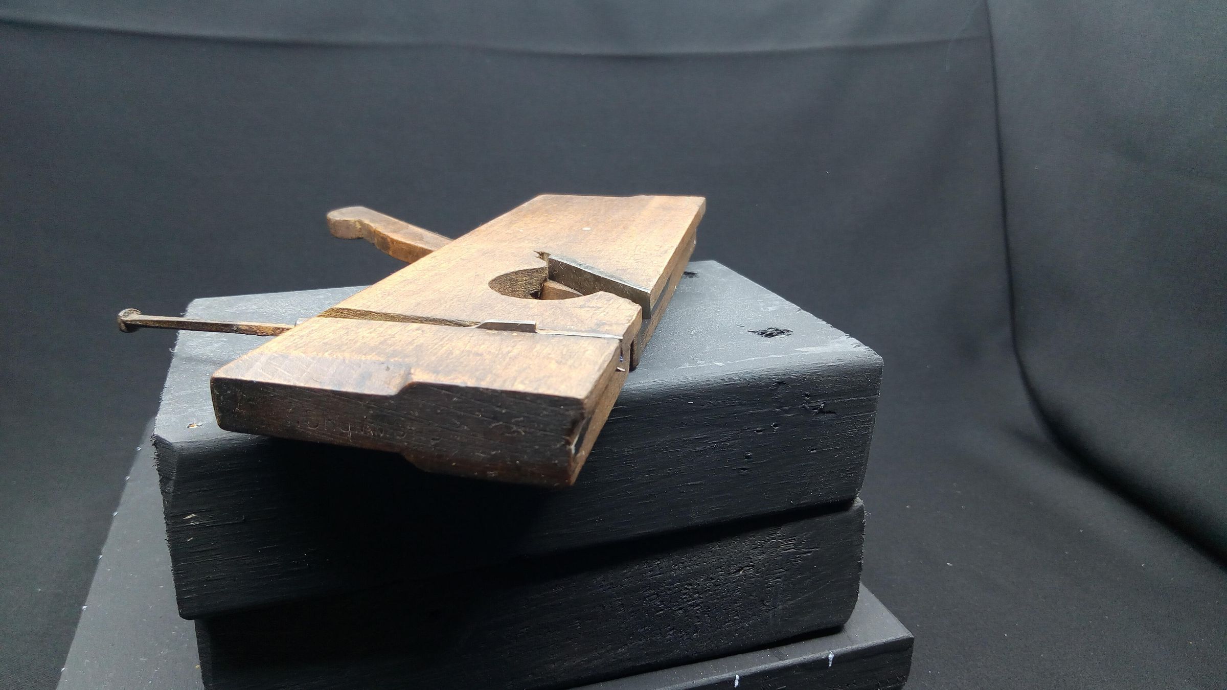 The main blade has been ground from a blade for a larger rebate plane. It is set straight across to avoid the extra complexity of skewing it. The front blade, the nickers, has been ground from a tiny 1/4 inch chisel, and is wedged with an old square cut nail. The body is cleanly shaped and the shaving escape hole very cleanly cut