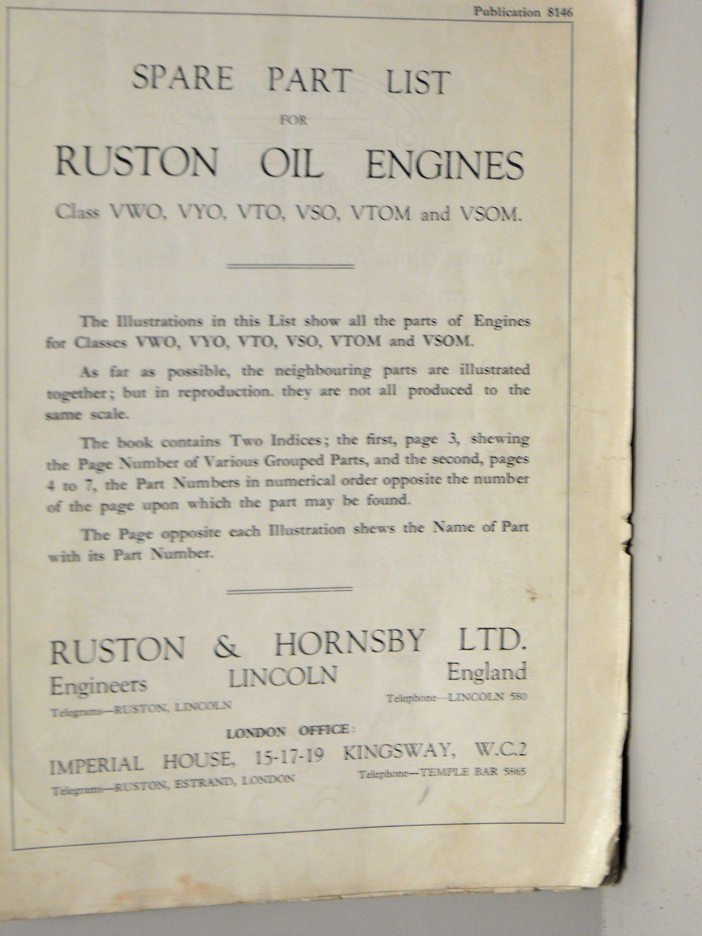 Spare parts list for Ruston oil engines. Class VWO, VYO, VTO, VSO, VTOM, VSOM