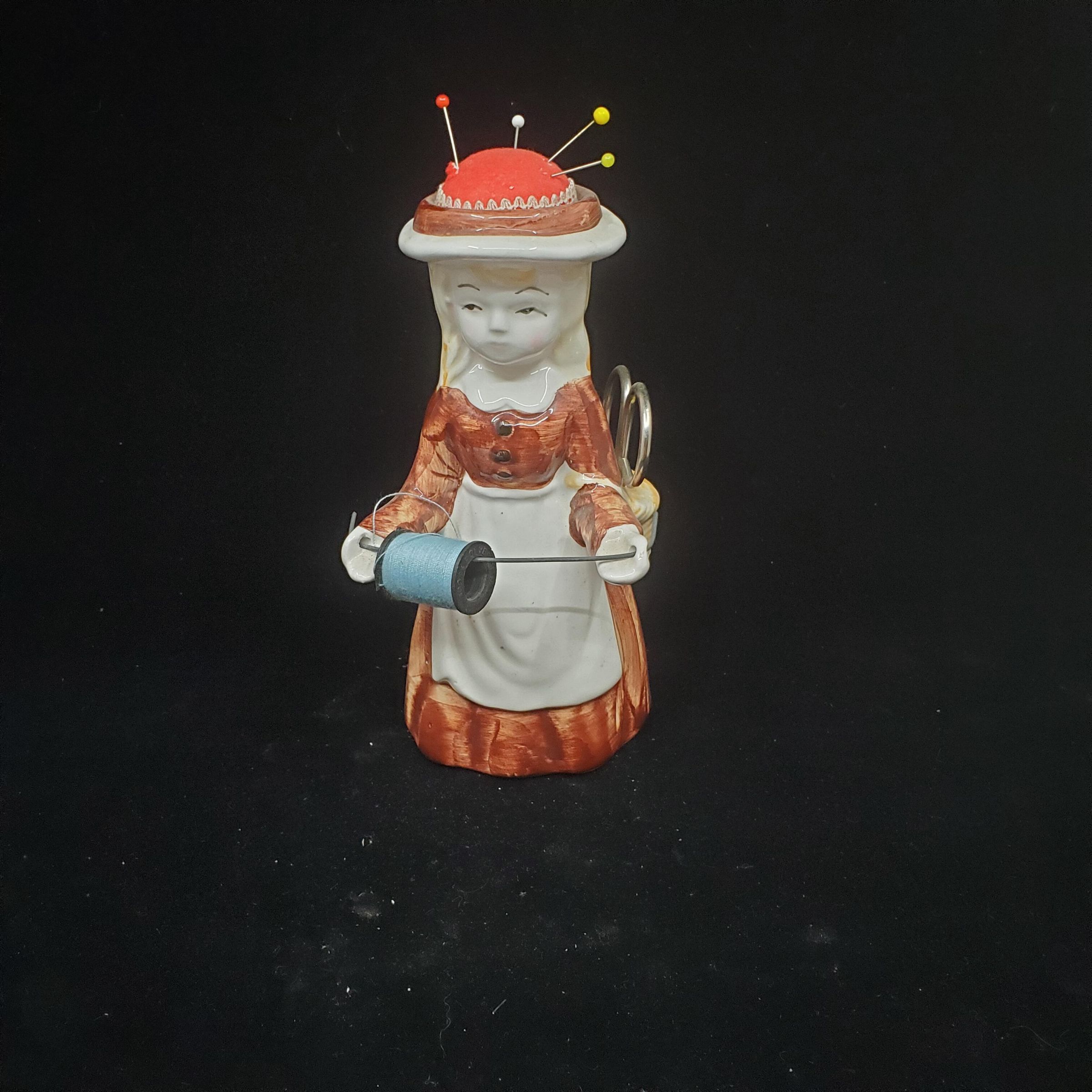 Ceramic lady, glazed, in brown dress, white apron, white and brown hat with red pin cushion top Yellow basket with scissors on hip. Short embroidery type scissors, don't close. Spool of blue thread on wire between hands in front. No marks.
