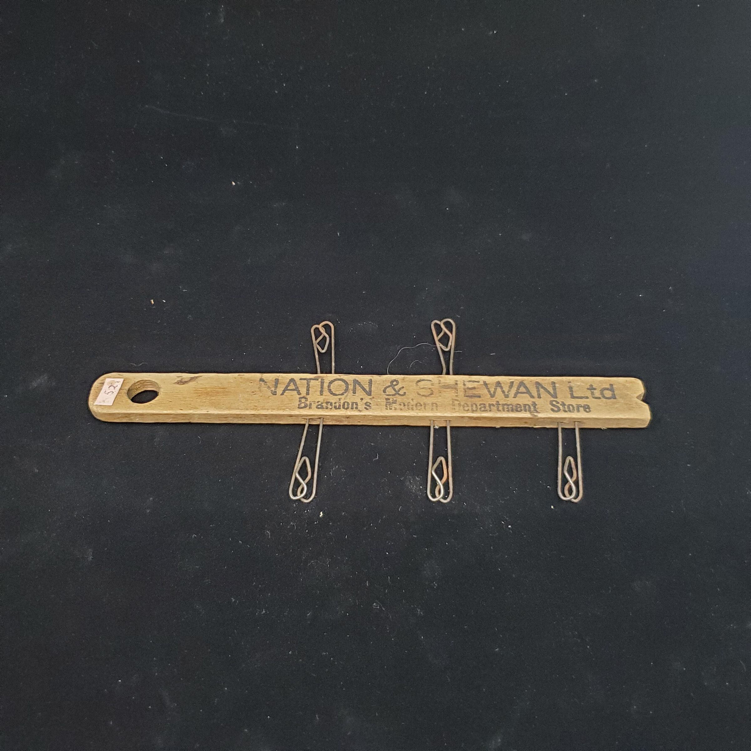 Wooden and wire spool holder and thread cutter. Long , mid brown, piece of wood with 5 twisted metal pieces for putting spools of thread. One missing. Hole in wooden piece at one end for hanging. Other end has notch for cutting thread. Advertising ÒNation&Shewan Ltd. BrandonÕs Modern Department StoreÓ in black on front. Instructions on back.