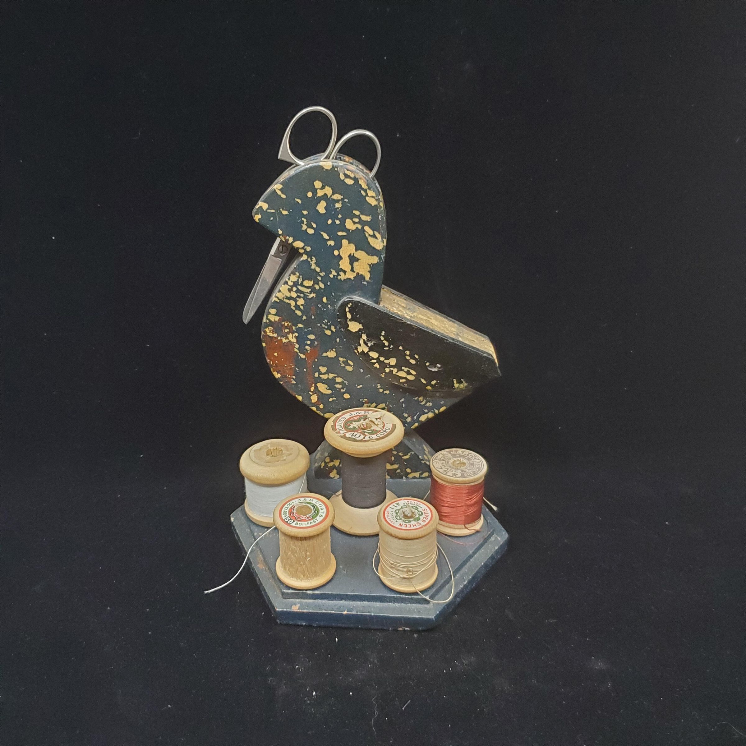 Combination thread holder, scissor holder and pin cushion. Wooden, painted dark blue and red streaks.with gold.Bird shape on round base. Base has 5 wooden pegs for spools of thread. Top of birds head open for scissors. Back of bird has cork set in for pin cushion.