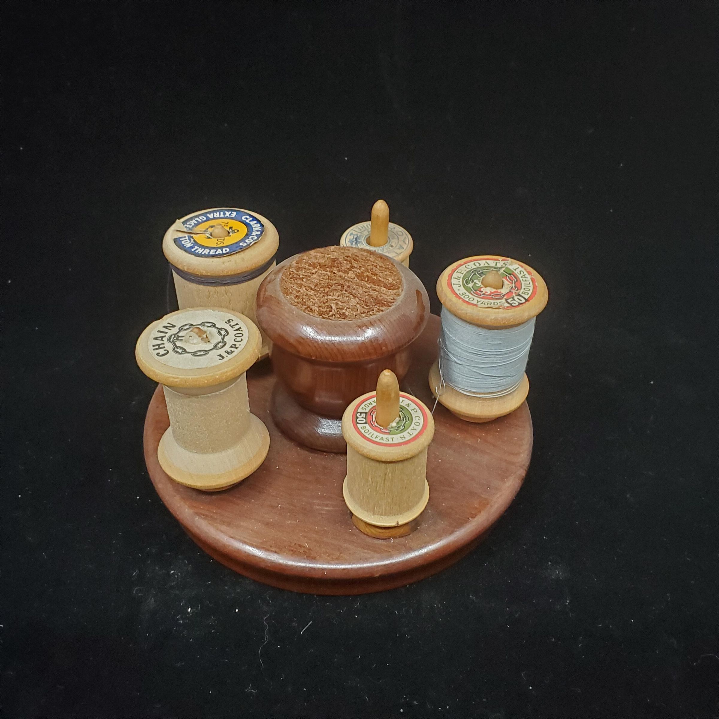 Wooden spool holder and pin cushion. Redwood. with 5 spool holders of a much lighter wood around a center wooden raised pin cushion. Stamped on back ÒSpool Holder California RedwoodÓ with a logo of 2 sprays of evergreen with cones.