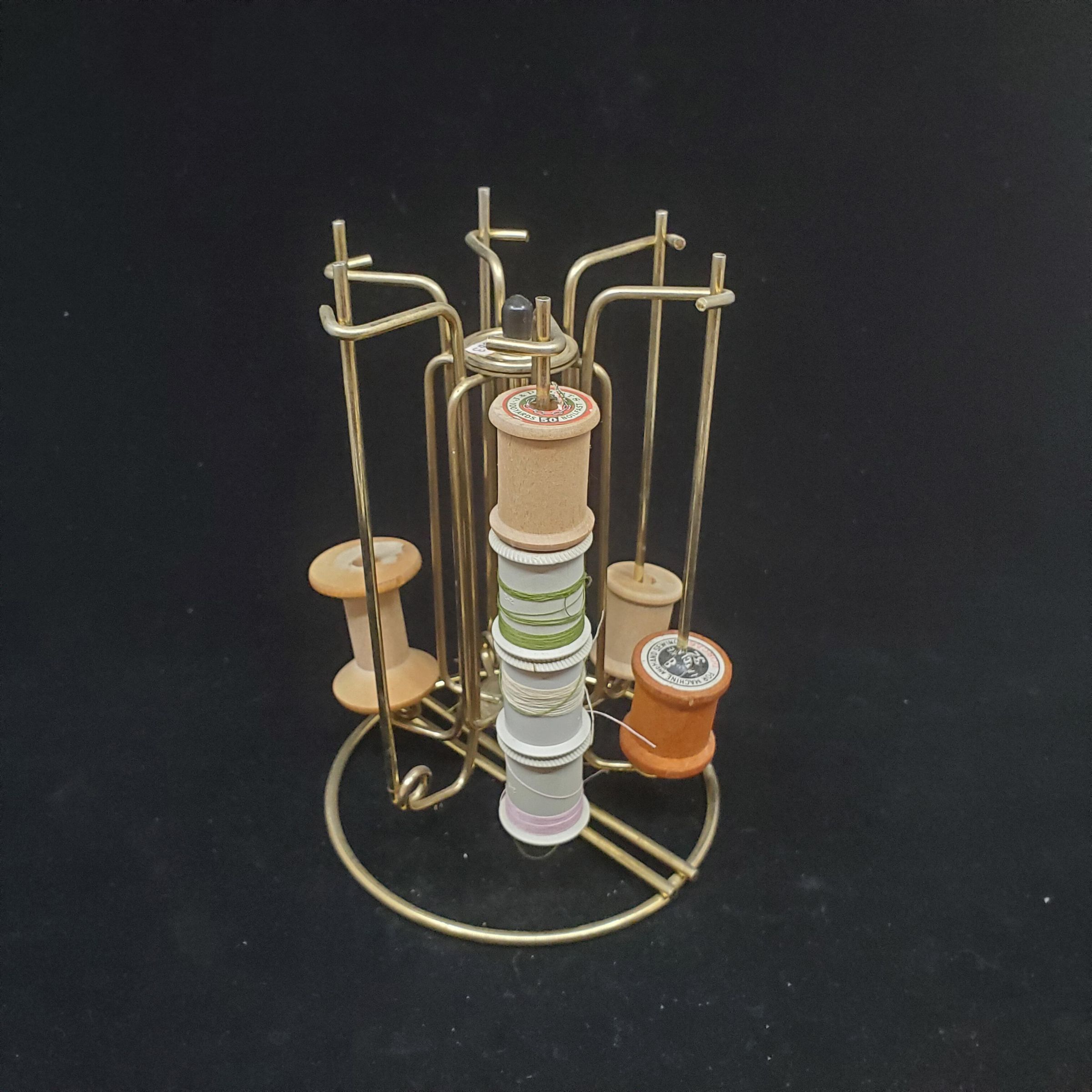 Brass spool holder. Circle base of coiled brass 1/4Ó thick,with 6 upright spool holders on a swivel. Will hold 24 small spools.
