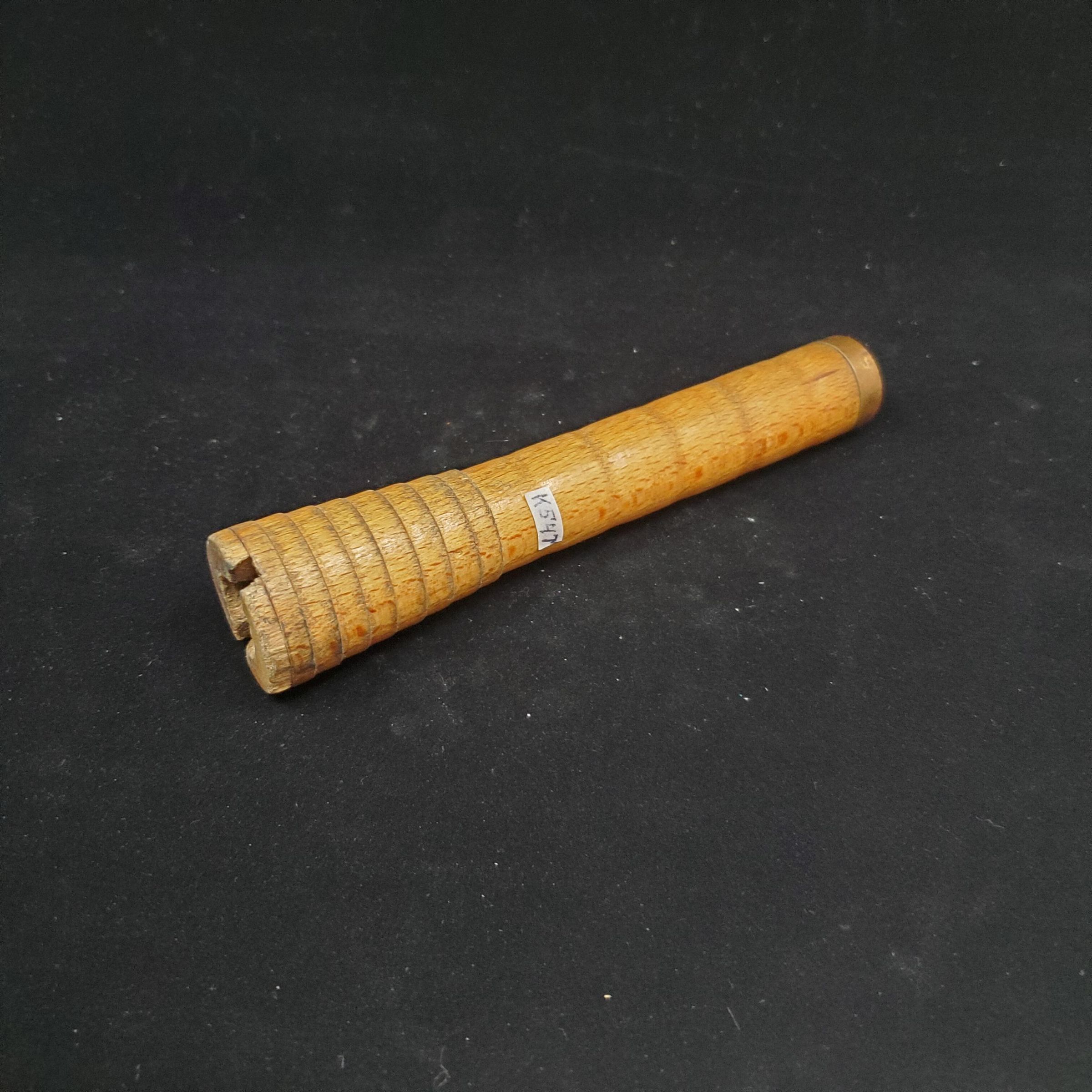 Light tan coloured wooden spool from a knitting mill. Metal bands at top and bottom