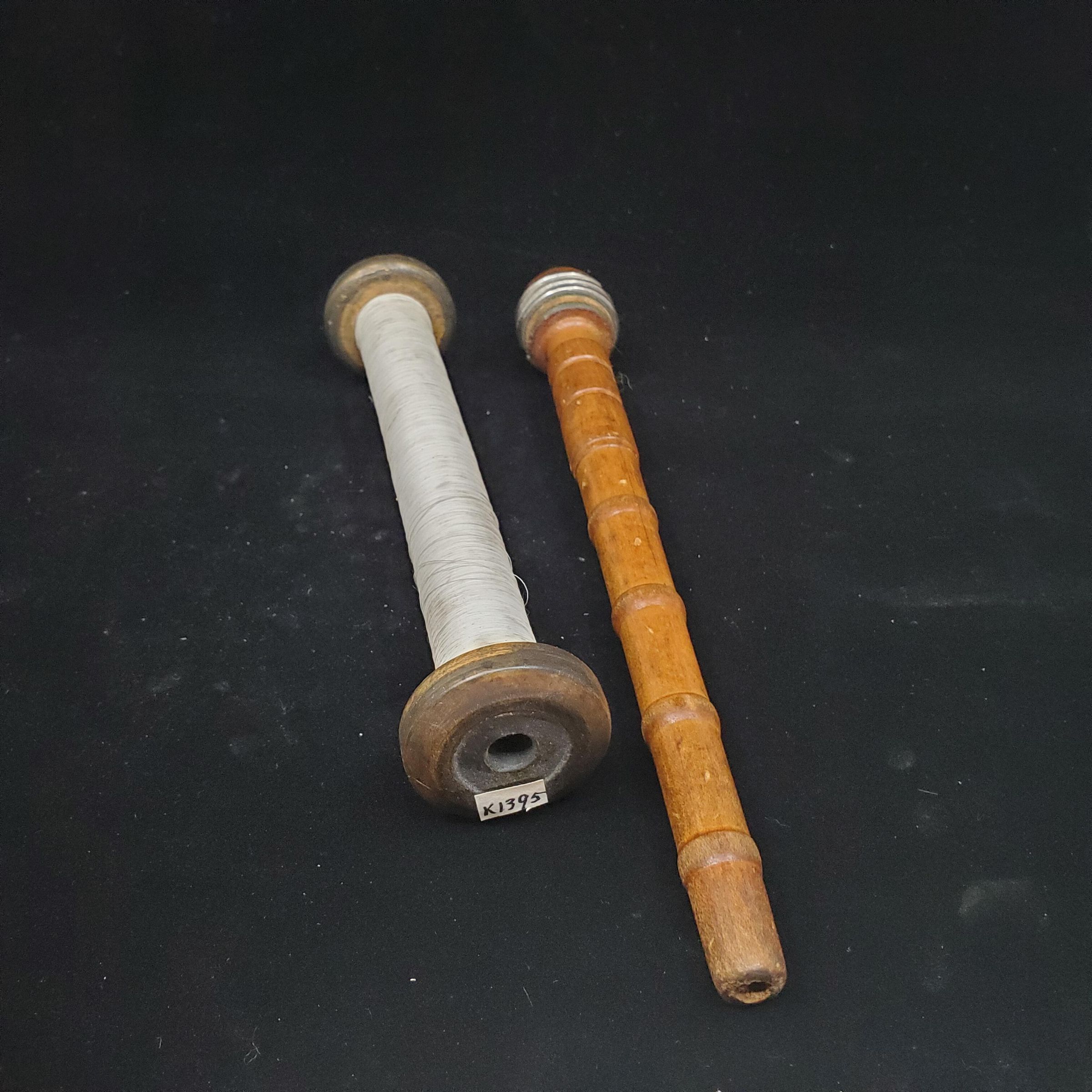 3 spools, i) dark brown & black in colour with many nicks in wood, no thread 2) tall, thin spool wiith white thread, ends blackish in colour 3) Blond wood with paper label for ÒManufactured by the Belfast Ropework Co.,Ltd., Belfast, Northern IrelandÓ and ÒBlack Linen LineÓ