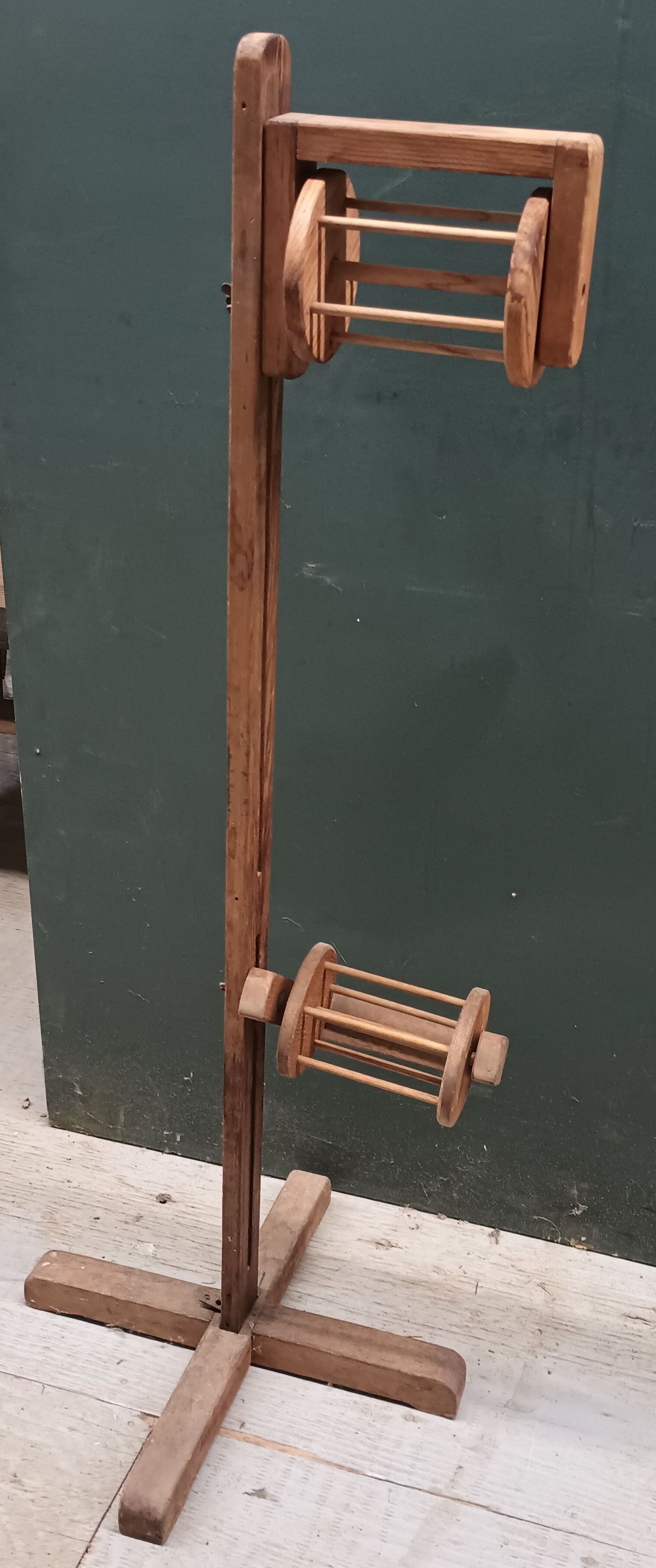 Wooden floor stand with two wooden spools.