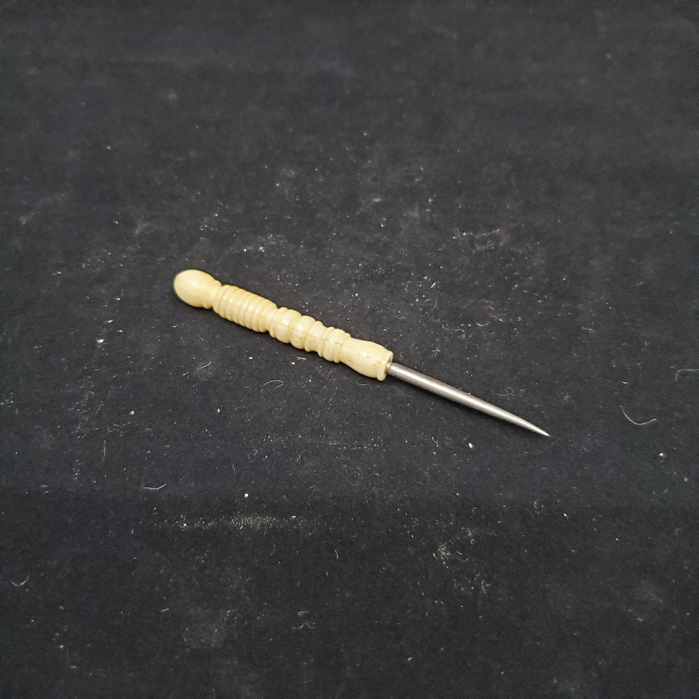 Bone handled stiletto. Metal is steel - rea cts to magnet.Bone handle is a series of indented lines with domed shape at top