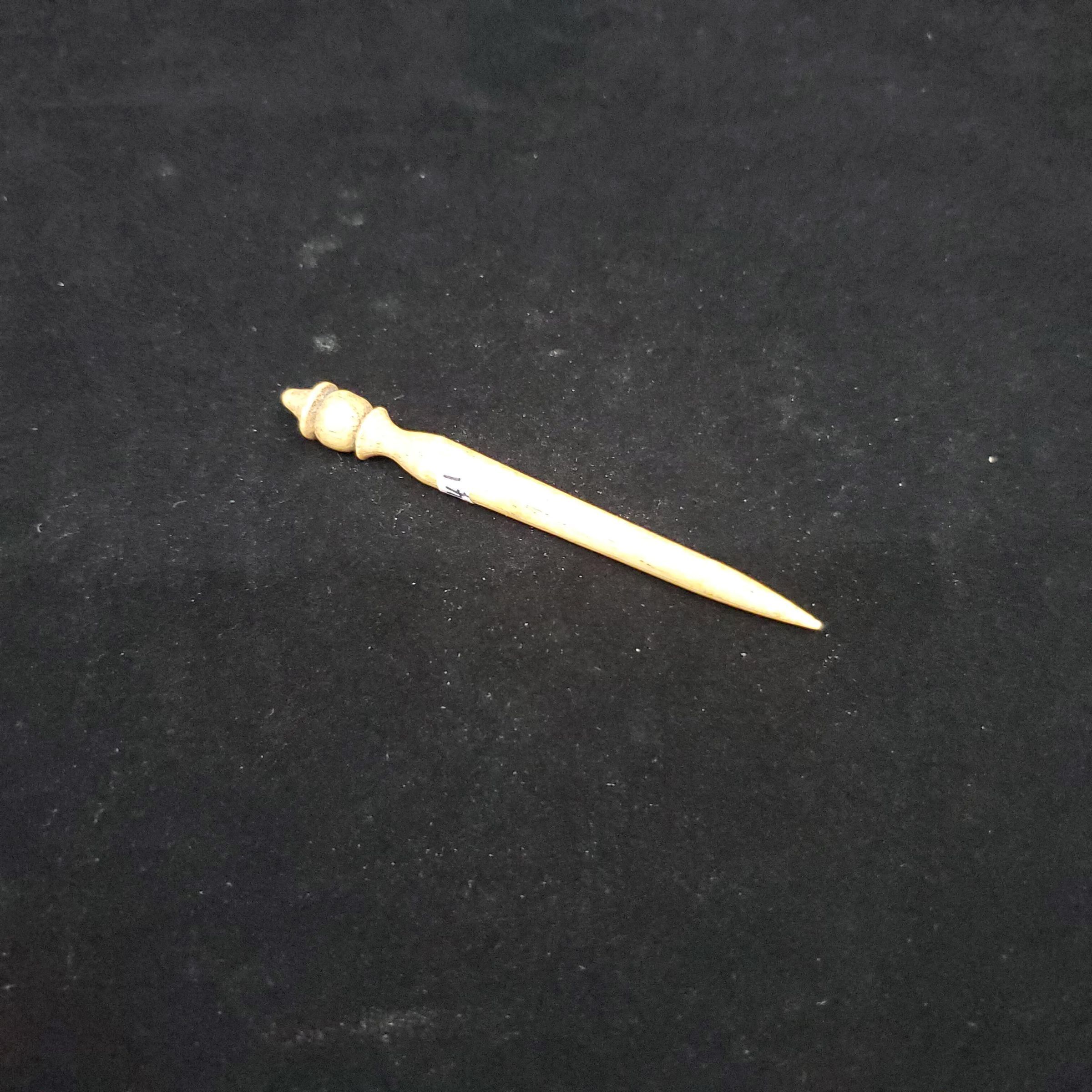 Wooden punch or stiletto with decorative carved top. Light brown colour with darker brown markings.