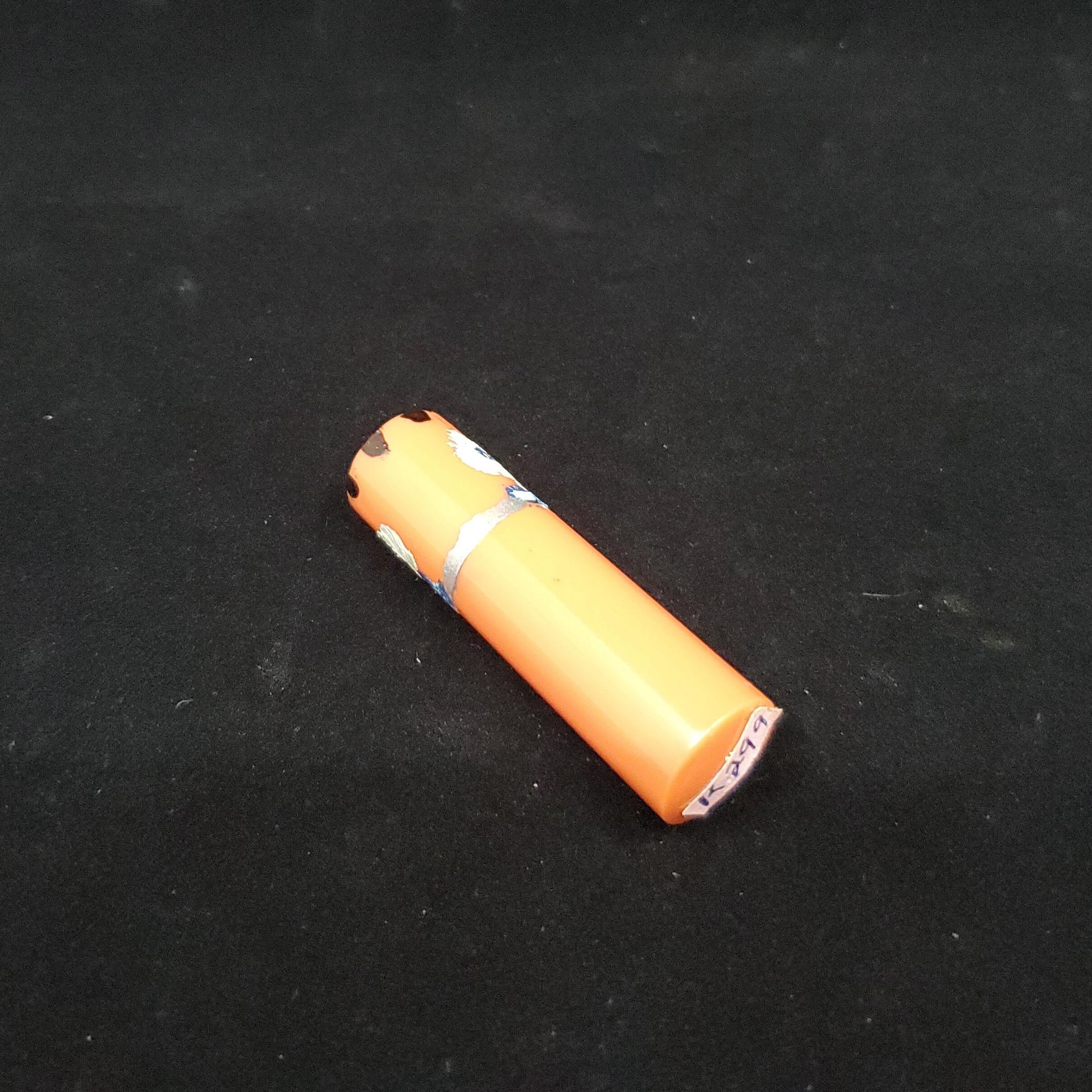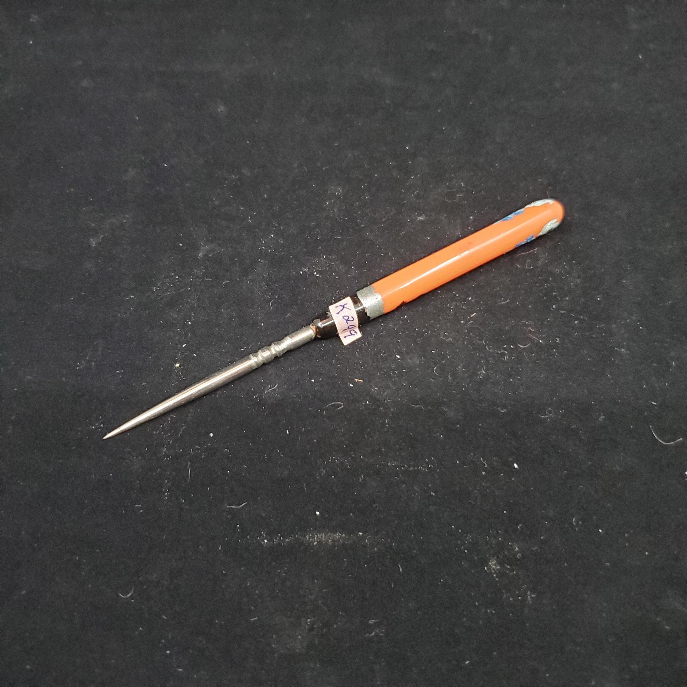 2 pieces. Steel stiletto with orangey - red celluloid handle. Handle painted with silver, shades of blue, white & black flower design. Case - matching - with top part having painted flowers. Push on top.