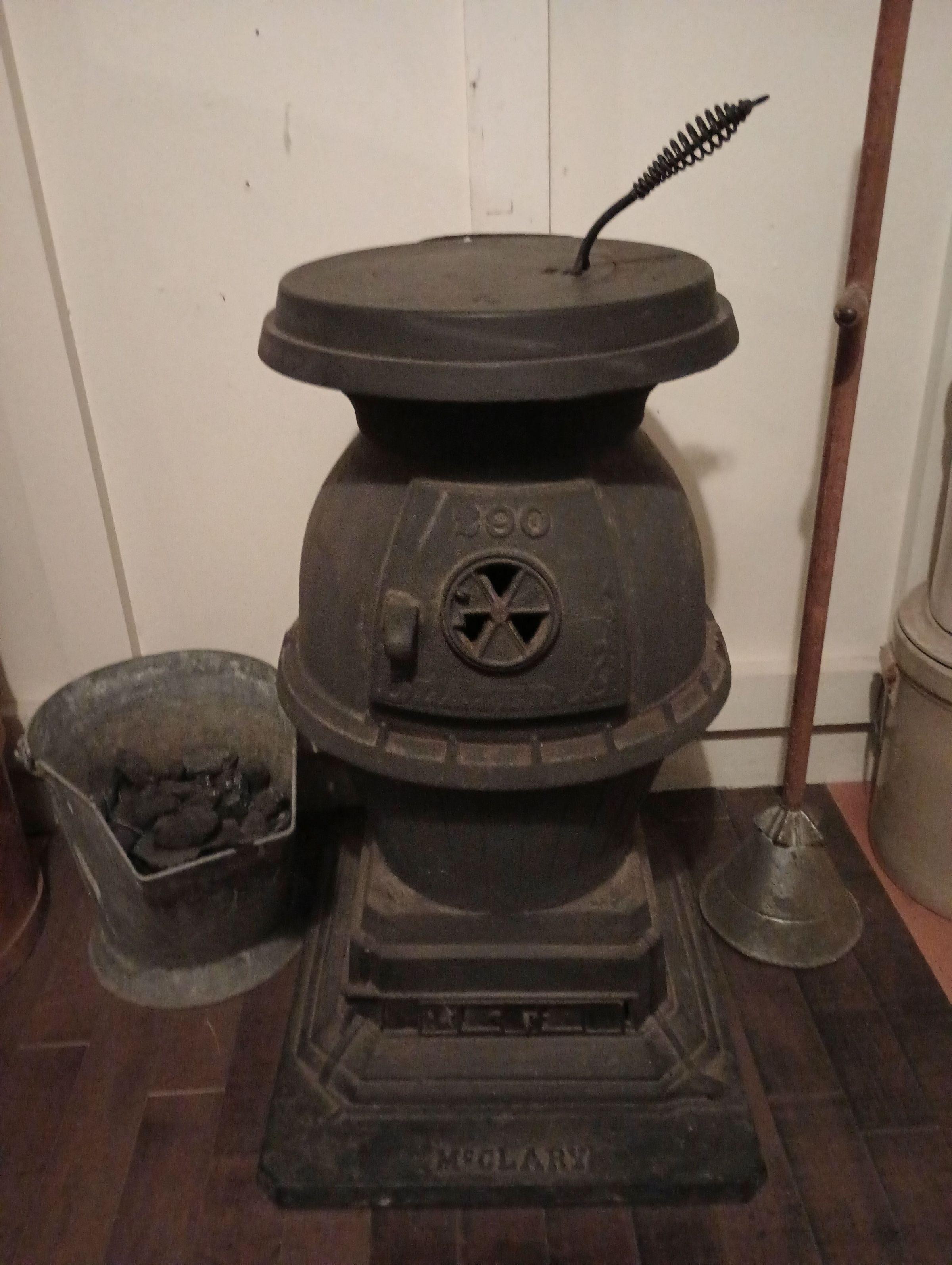 Cast iron pot bellied coal stove. Model 290 Blazer. Manufactured by McClary, London Ontario.Context