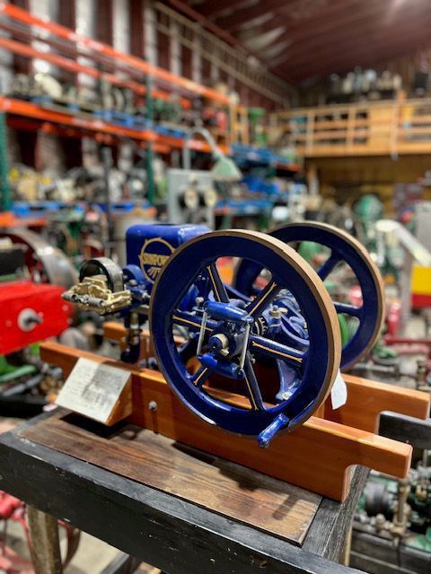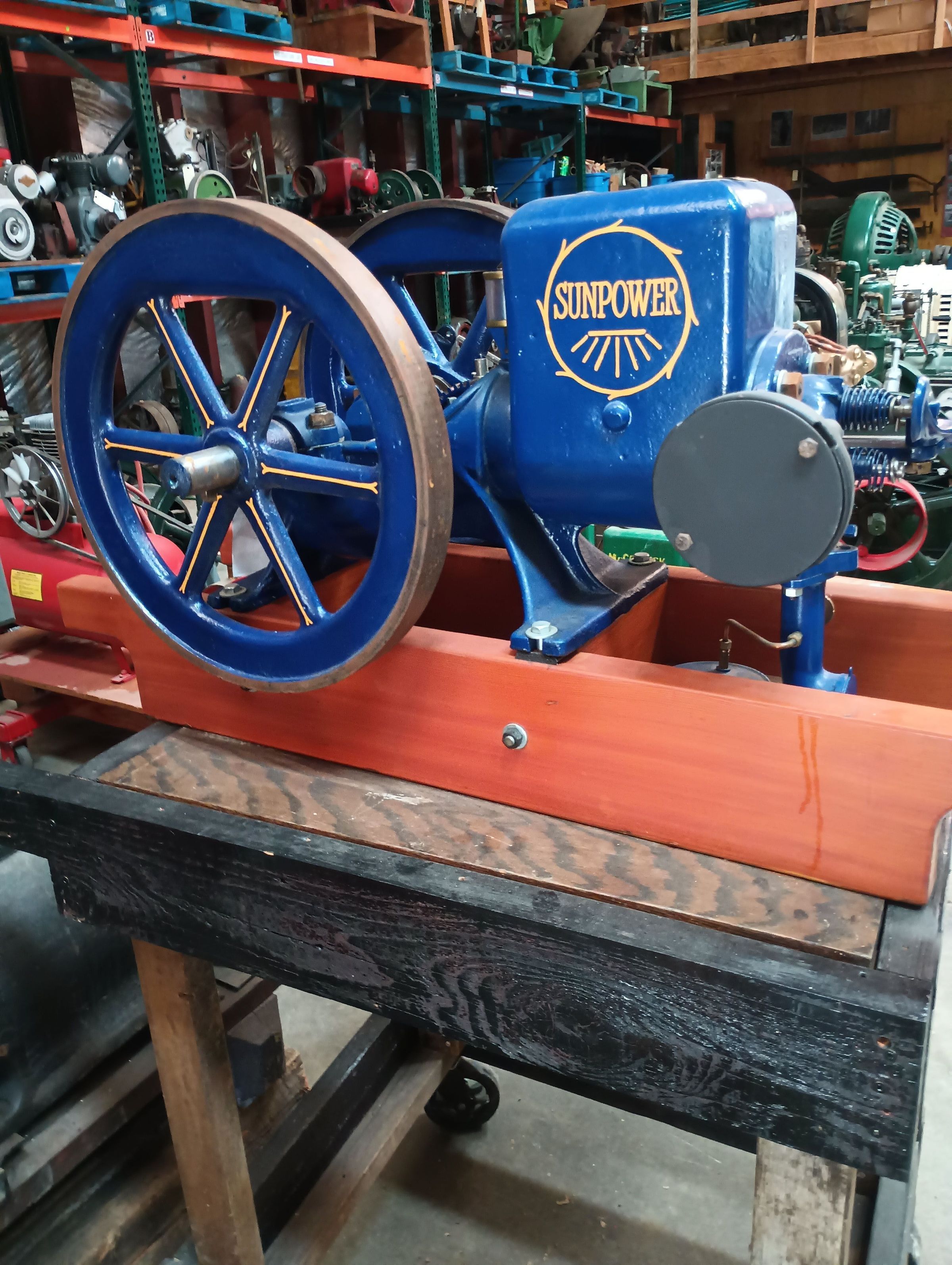 Blue Sunpower 1 3/4 HP horizontal gas engine circa 1915. Restored by T.B. Stamp 1989.