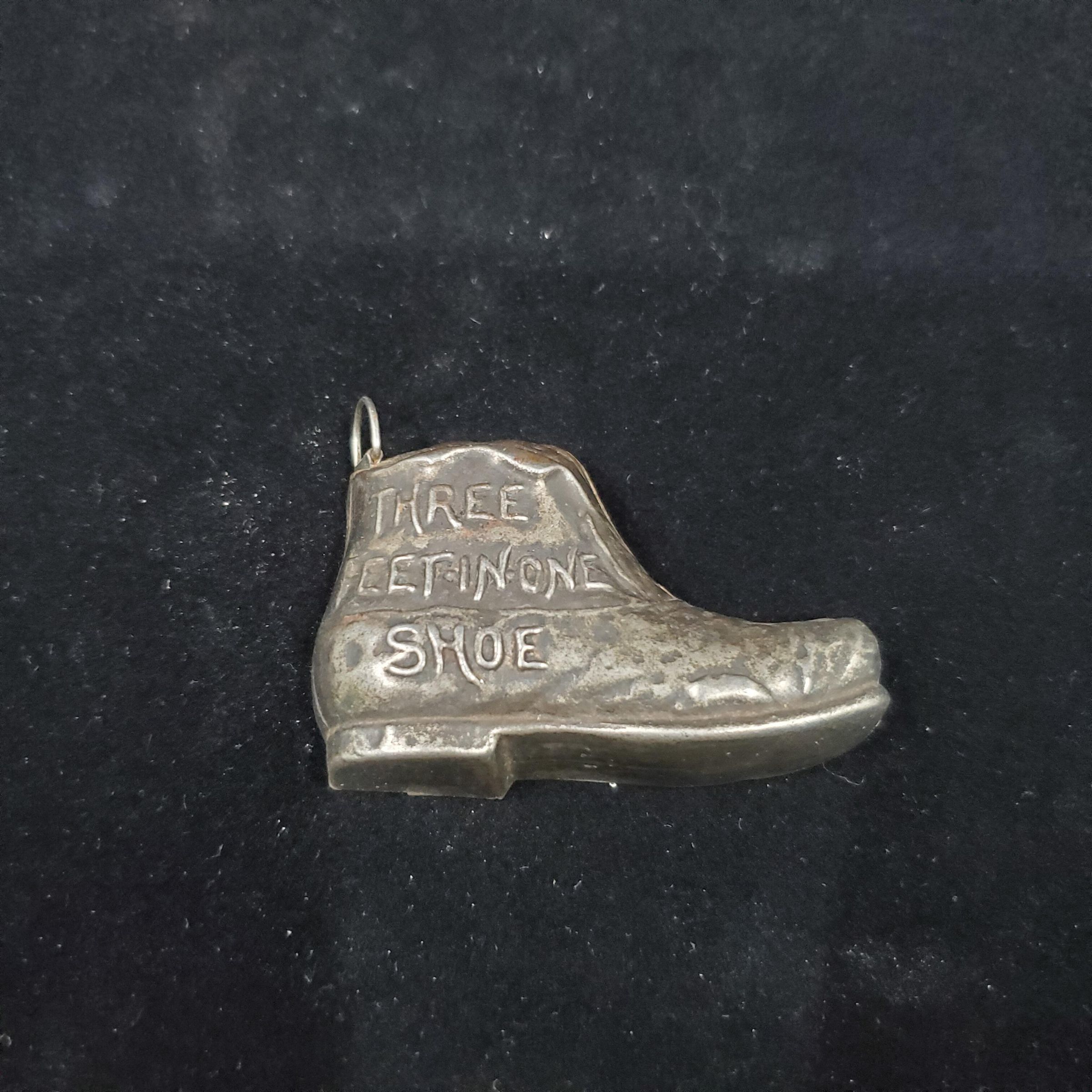 Tape measure in shape of steel shoe. Flat back. Front of shoe has words ÒThree Feet in one ShoeÓ on it.Cloth tape, metal end. Tape comes from top back of shoe.
