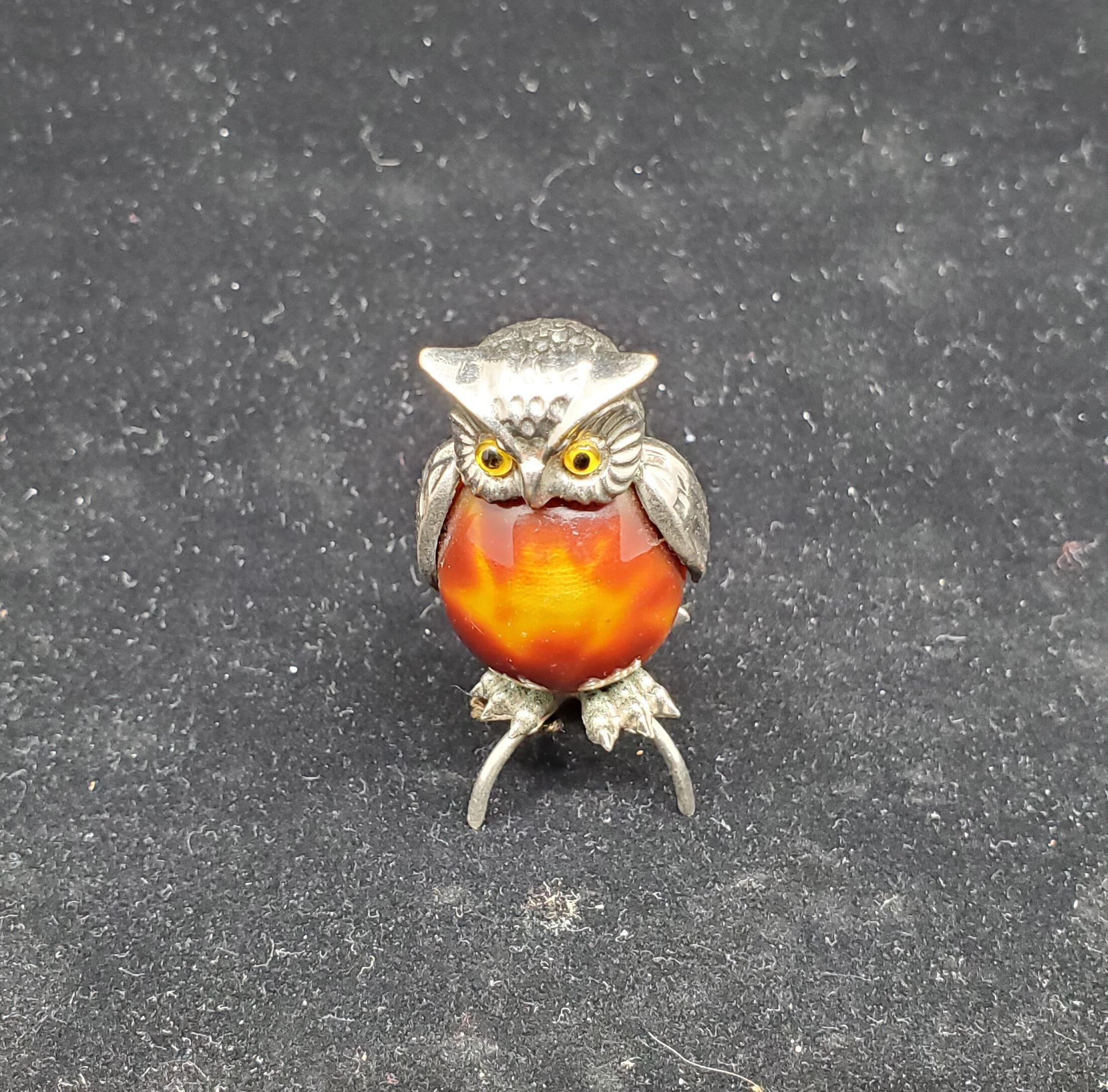 Tape measure in shape of Owl. Owl body, in tortoise shell brown colour with silver coloured metal feet, head and wings. Owl sits on a 3 pronged base - of silver coloured metal - legs are curved and can be turned to rewind the tape.Tape is cloth with metal end. and comes out of back of owl.