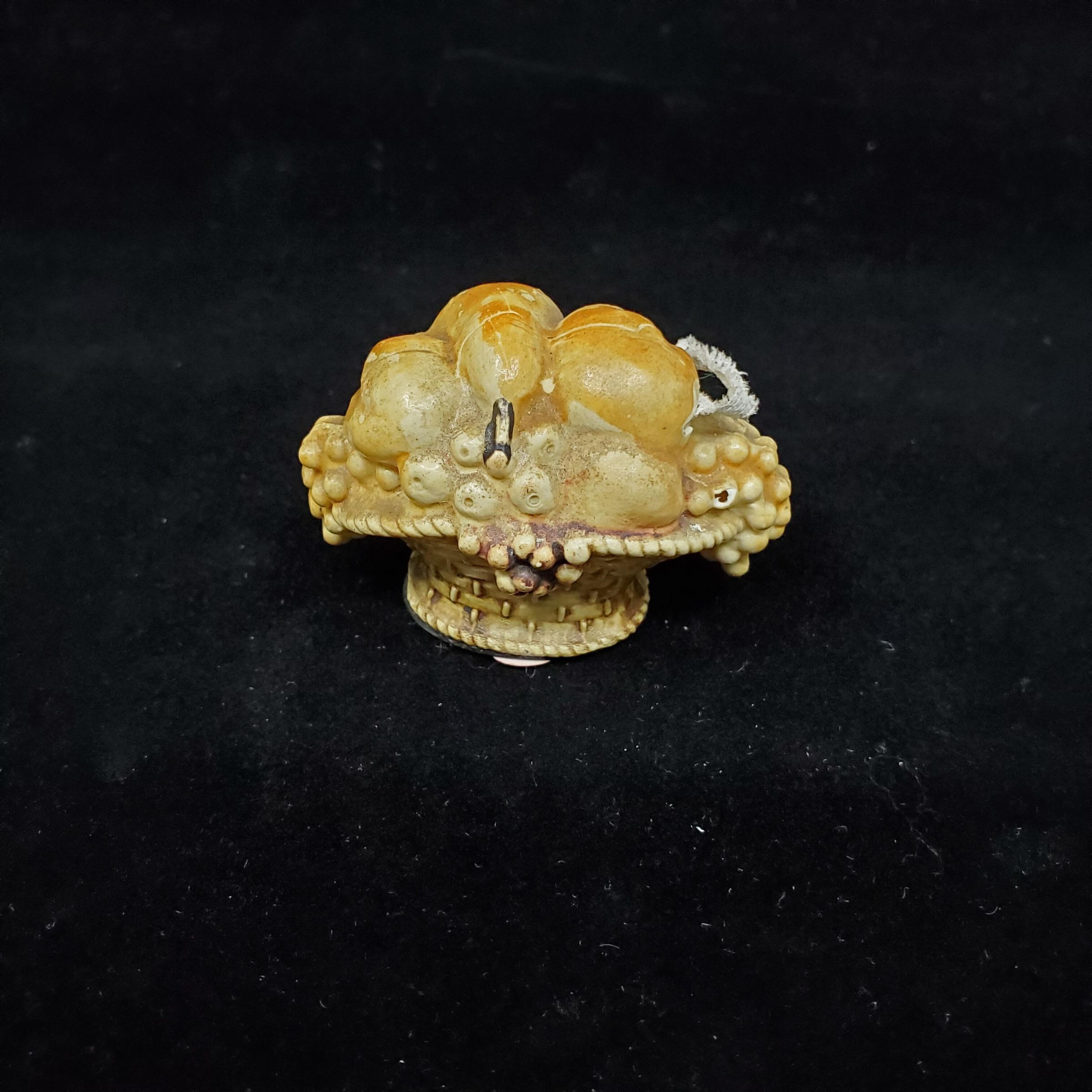 Celluloid tape measure in shape of basket of flowers and fruit. Spring mechanism. End of tape metal.