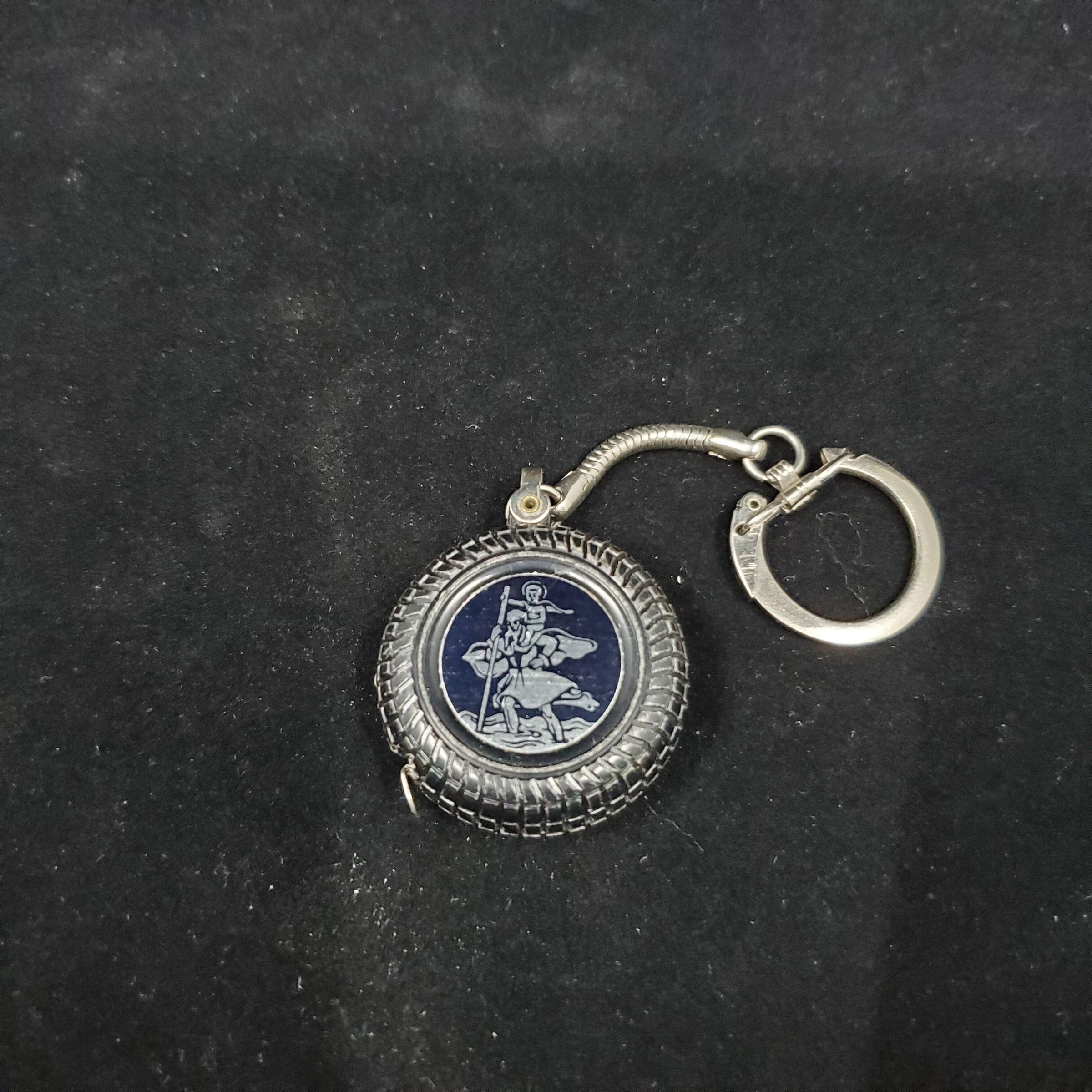 Tape measure key ring. Tape is small round black plastic tire with same picture in center back and front.Picture in grey on black - looks like father time and new year child but is probably some companyÕs logo.Metal tape and end. Metal key chain.