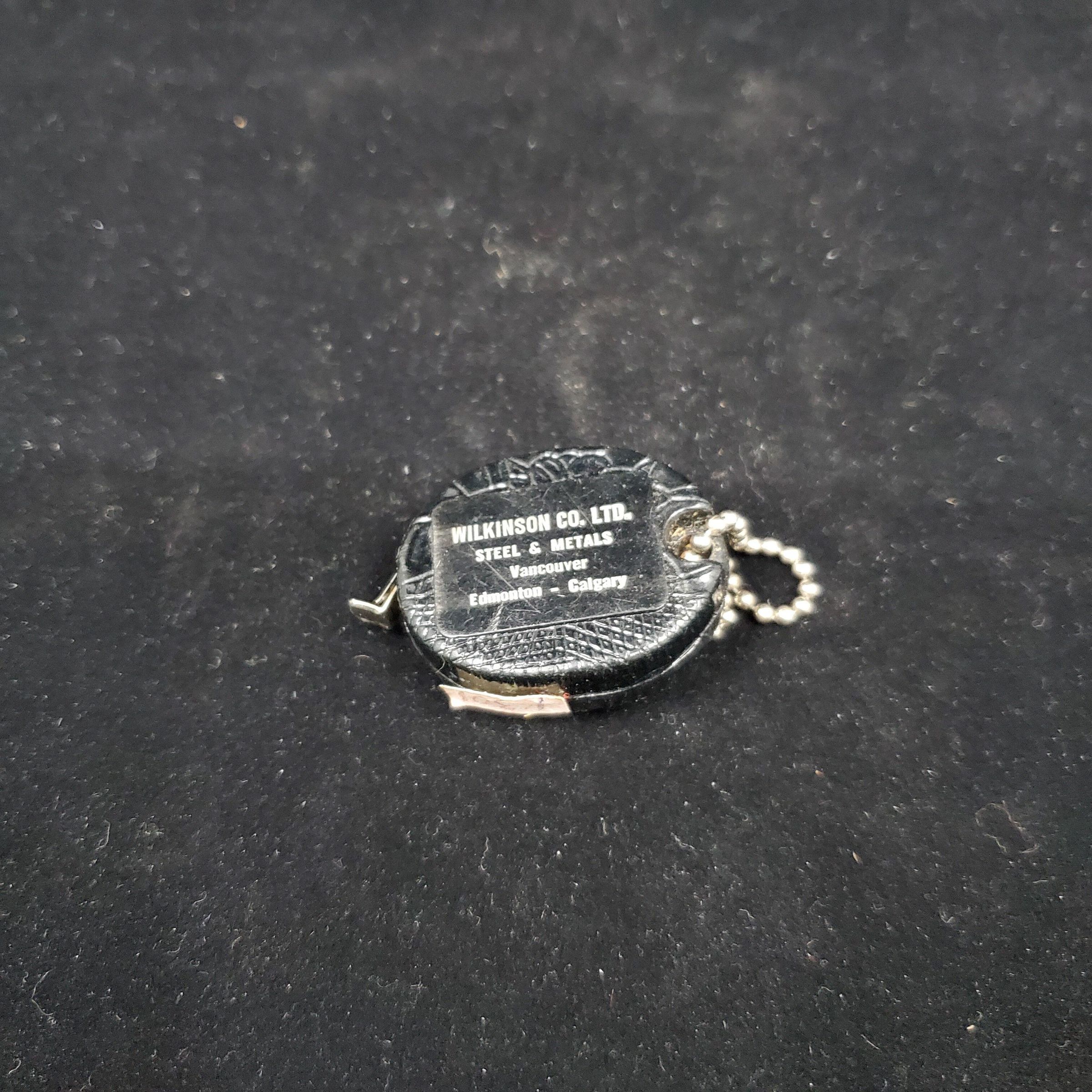 Advertising tape measure key ring. Black oval shape with advertising in white print on both sides :ÓWilkiinson Co. Ltd. Steel & Metals Vancouver Edmonfon CalgaryÓ