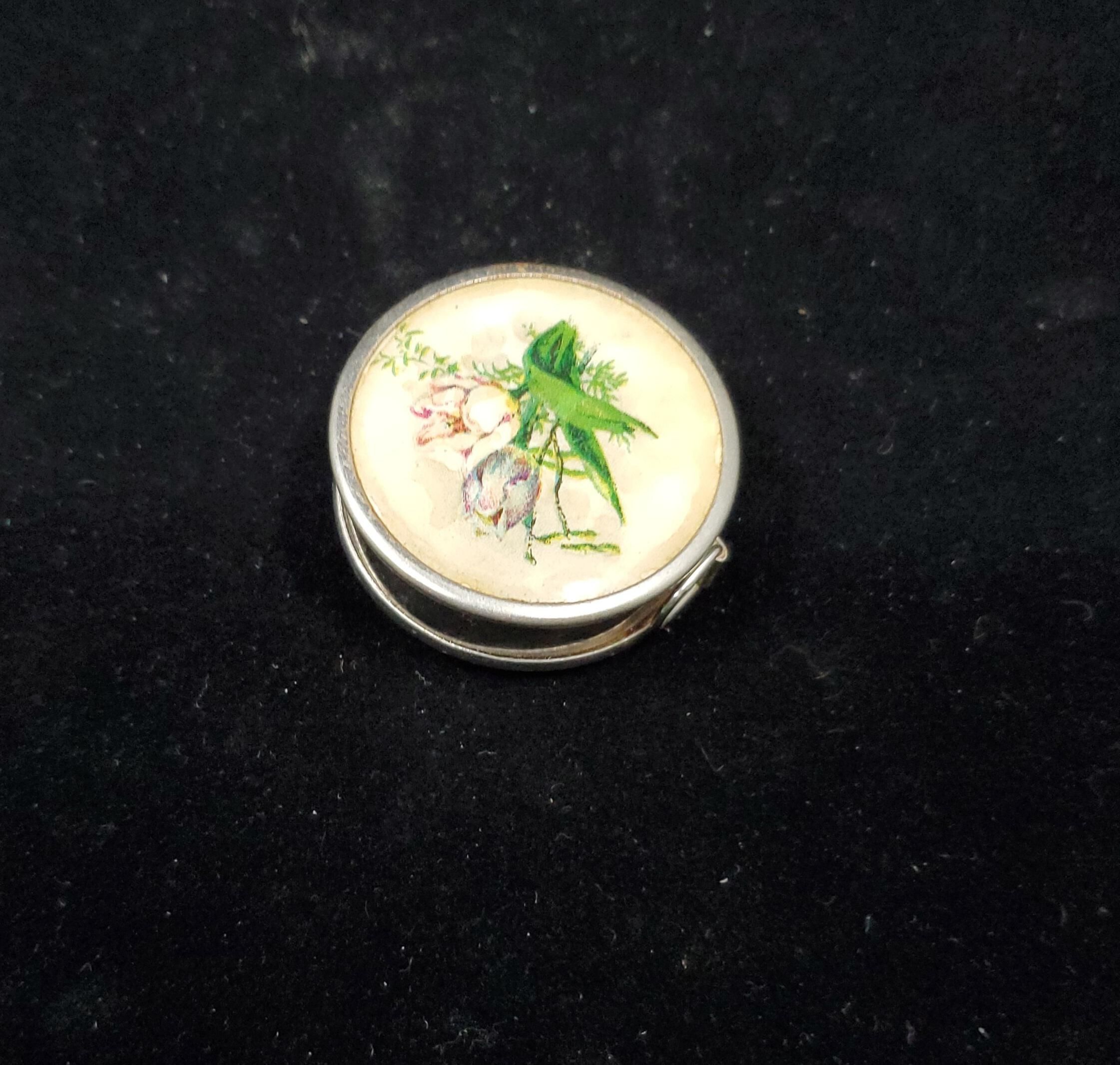 Round tape with plastic painted top. Spray of tulips with leaves on top. Spring type mechanism Steel casing. Stamped Germany West Zone.
