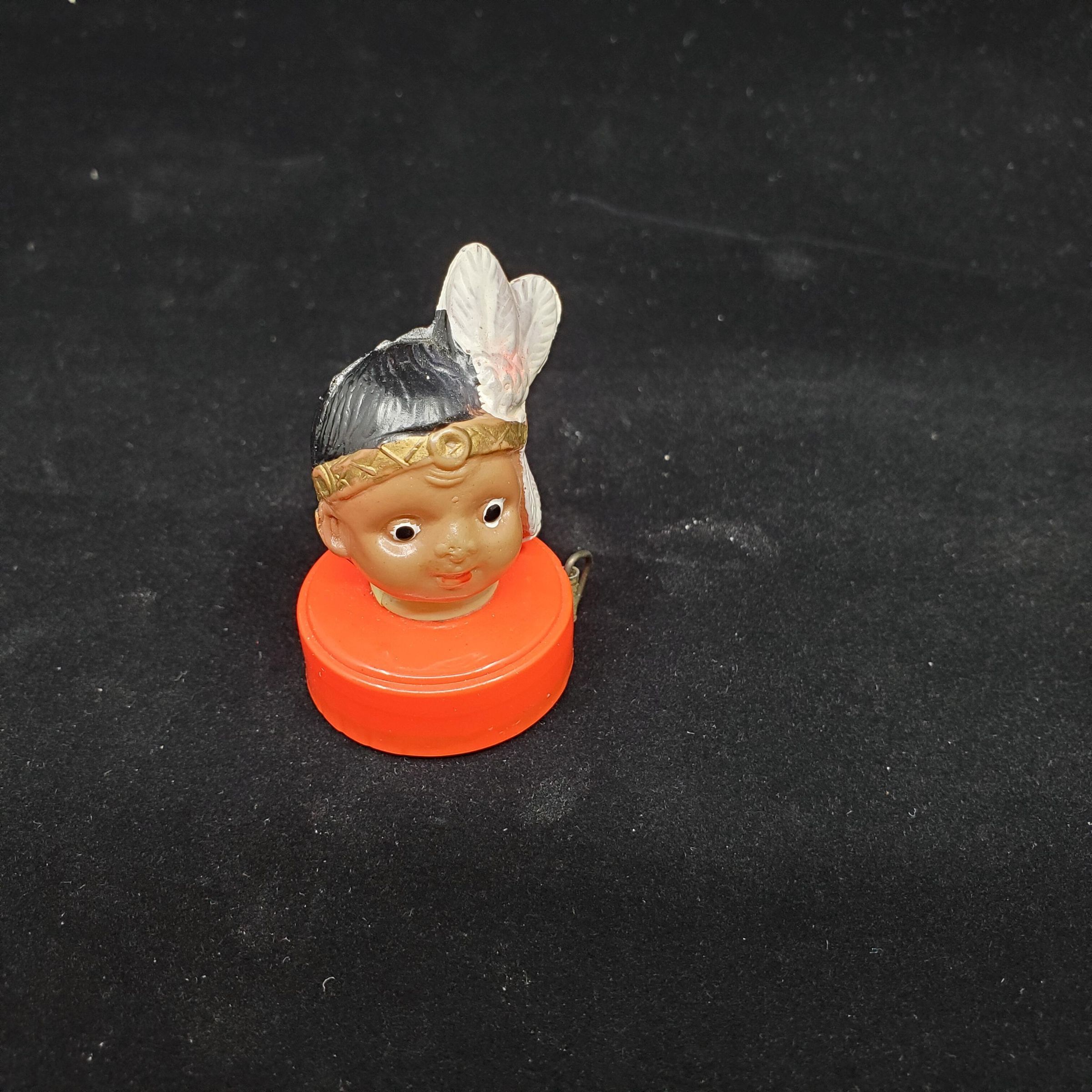 Celluloid tape measure. Red disc contains tape. On top Indian Head in colour with feathers head band. Stamped Japan on base of tape.