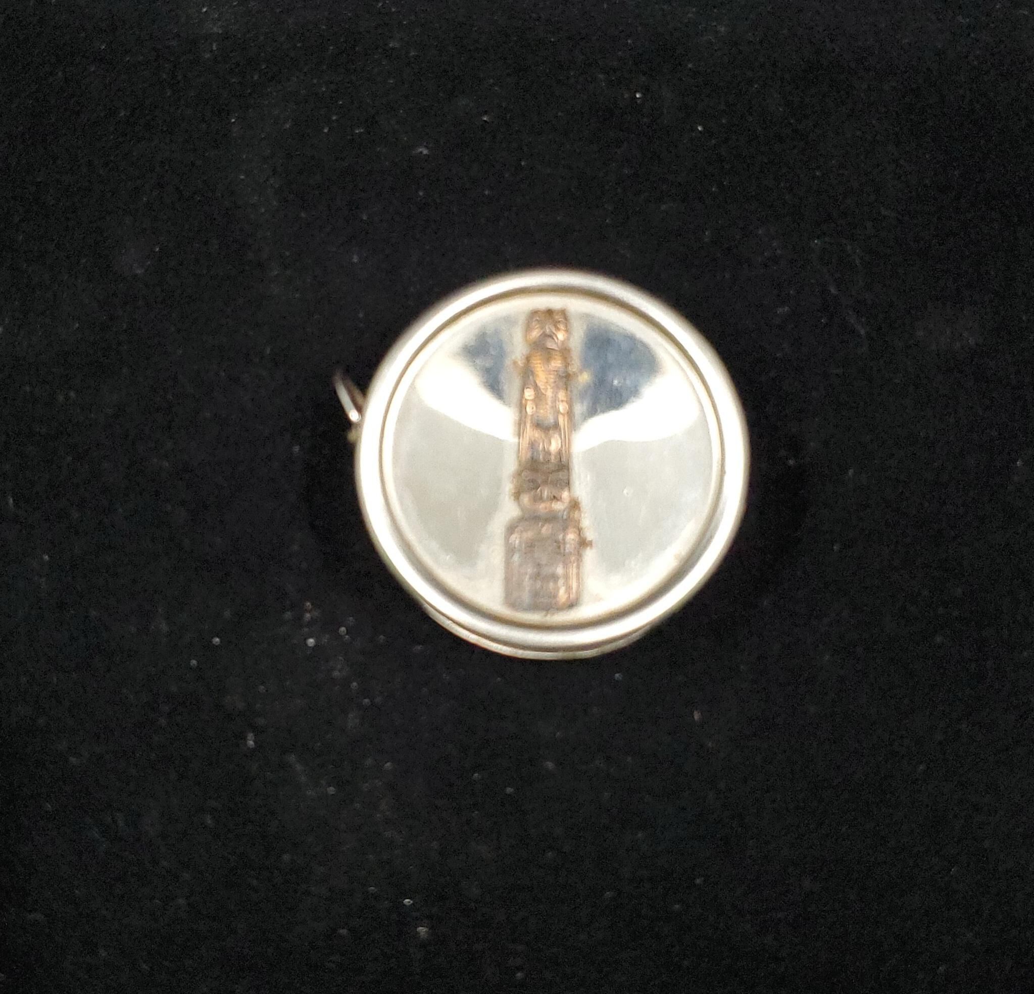 Round metal tape measure with a copper Totem pole in center of top. Tape case is steel. Cloth tape with steel end . Spring mechanism.